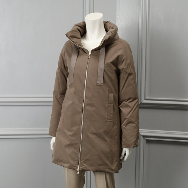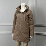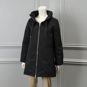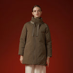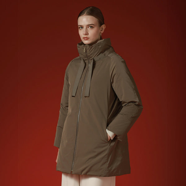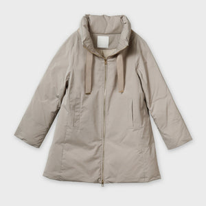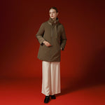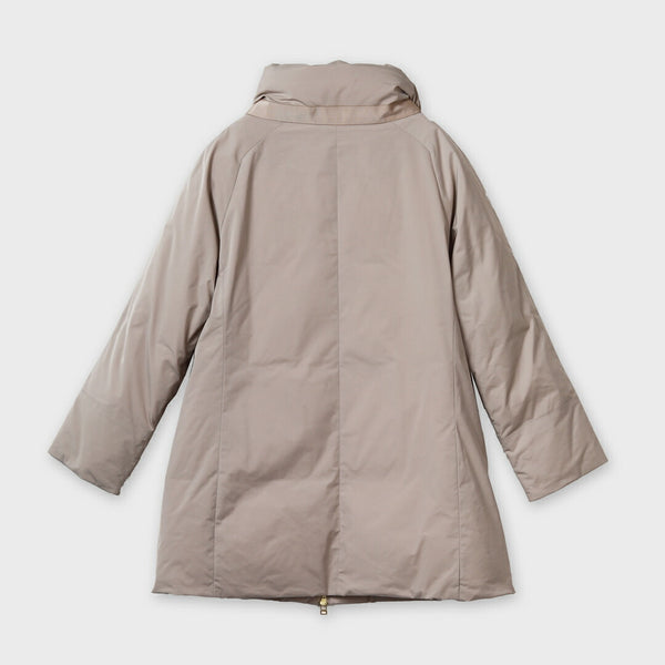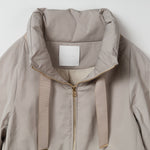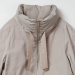 高さのある大きめのスタンドカラーにし、小顔効果とお顔周りの暖かさがポイント。
