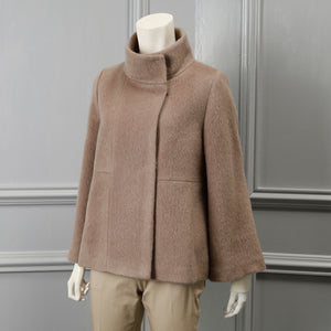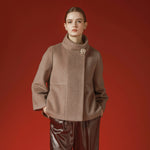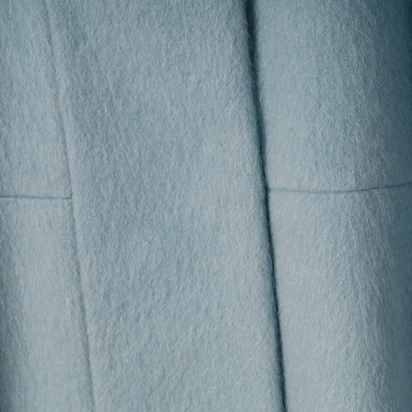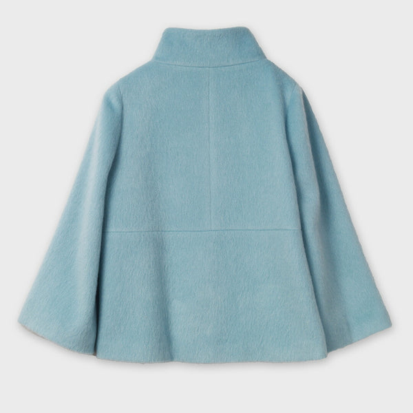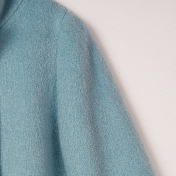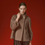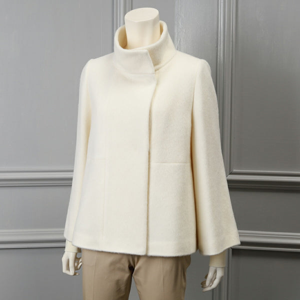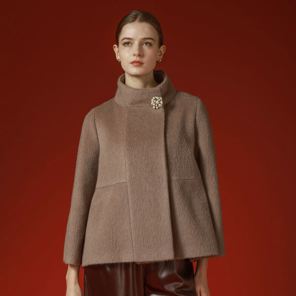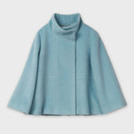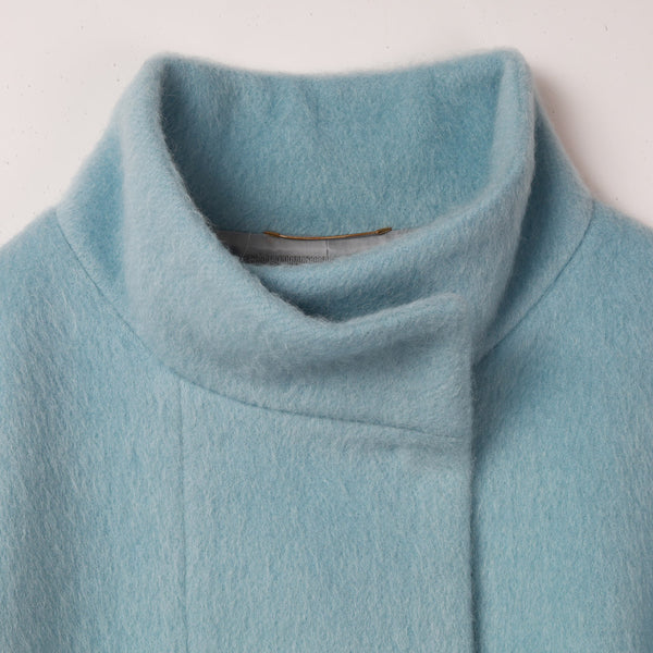 スタンドカラーの衿は高さがありながら顔に当たらず、開けて着用してもウイングカラーのように綺麗に収まります。