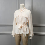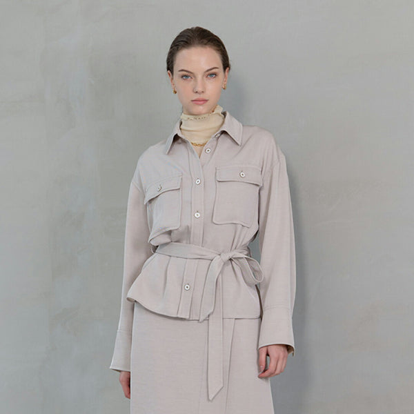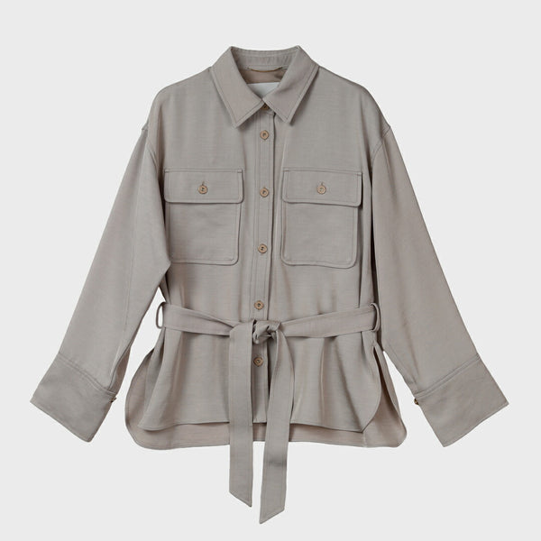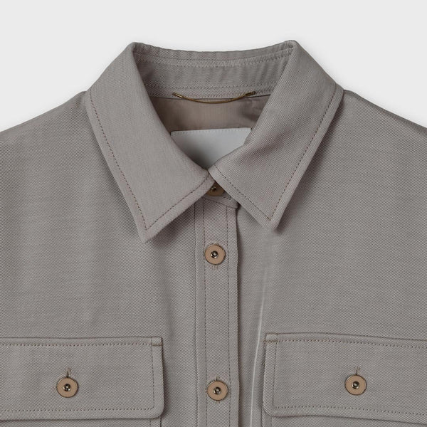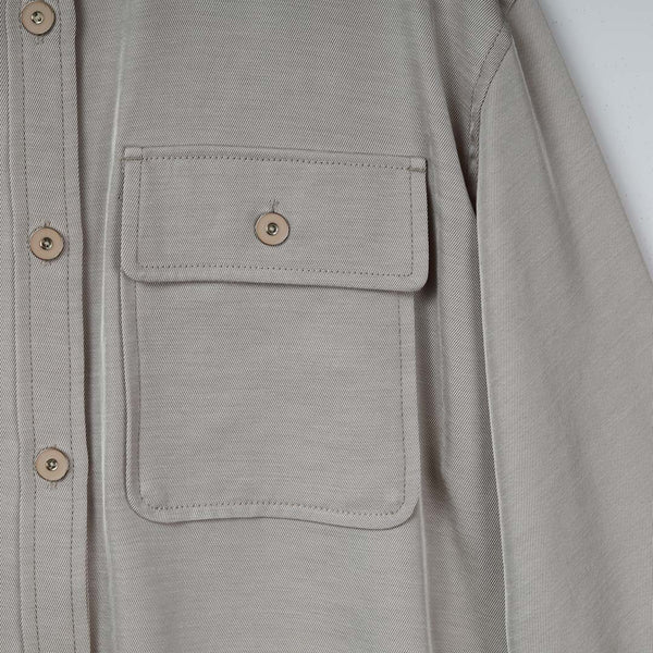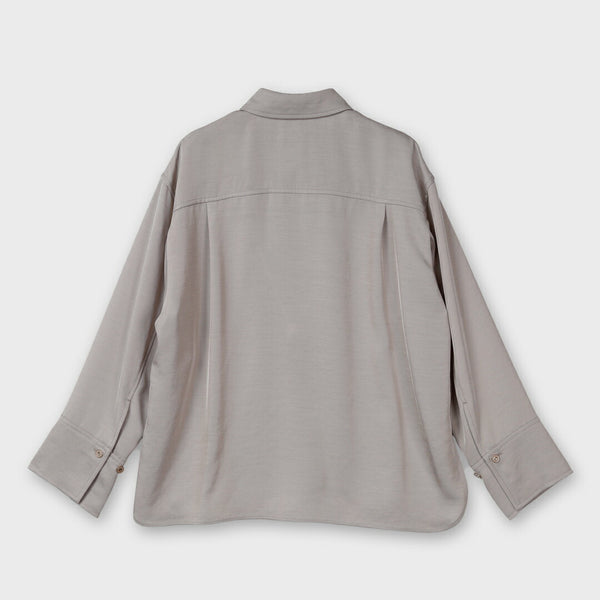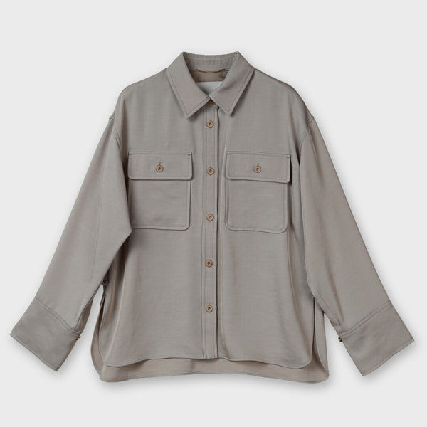 キレイ目の合繊素材を使用した、シャツとジャケットの中間アイテム。