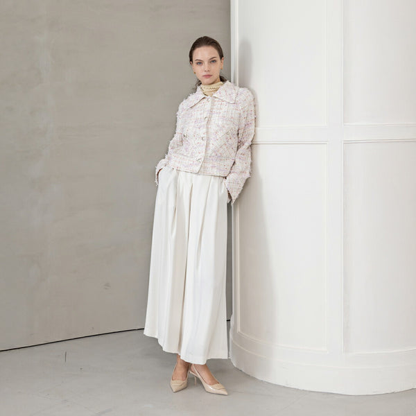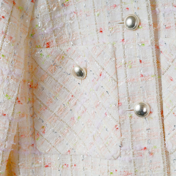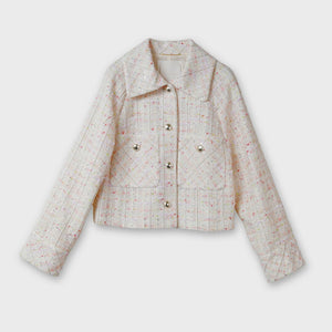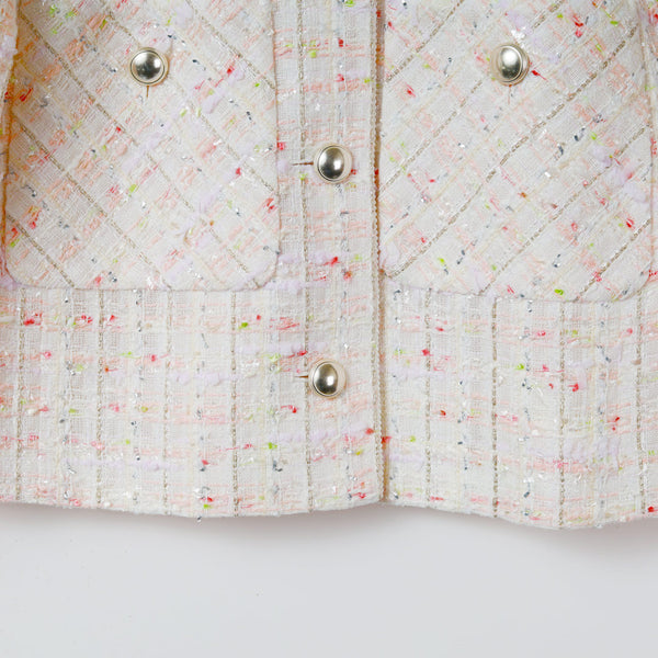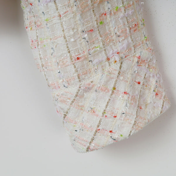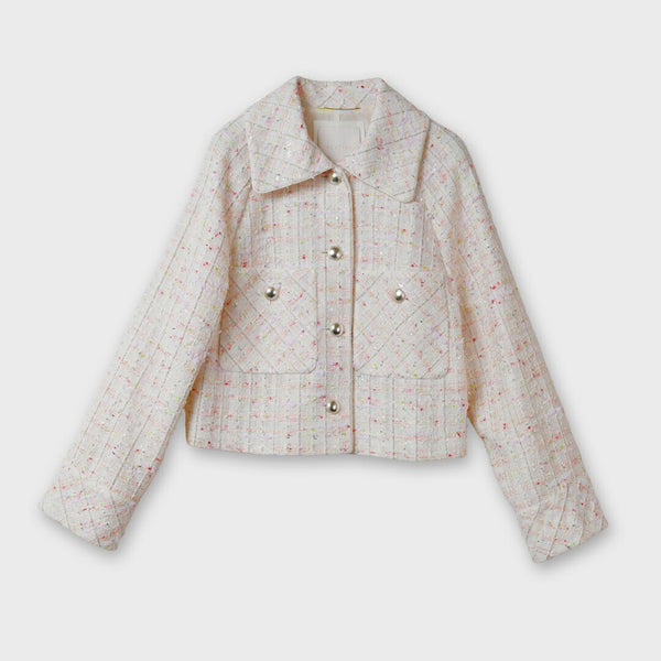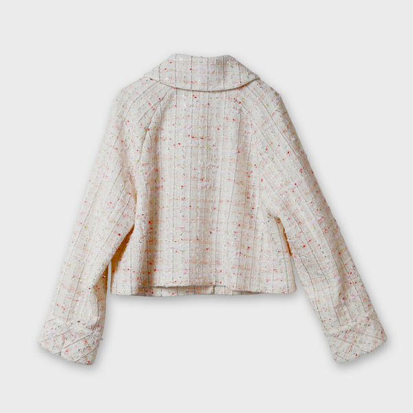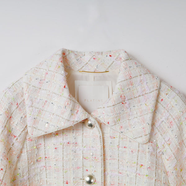 多種のファンシーヤーンを贅沢に織り込んだ、尾州産の国産ミックスツイードを使用した春向けショートジャケット。