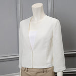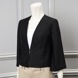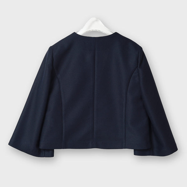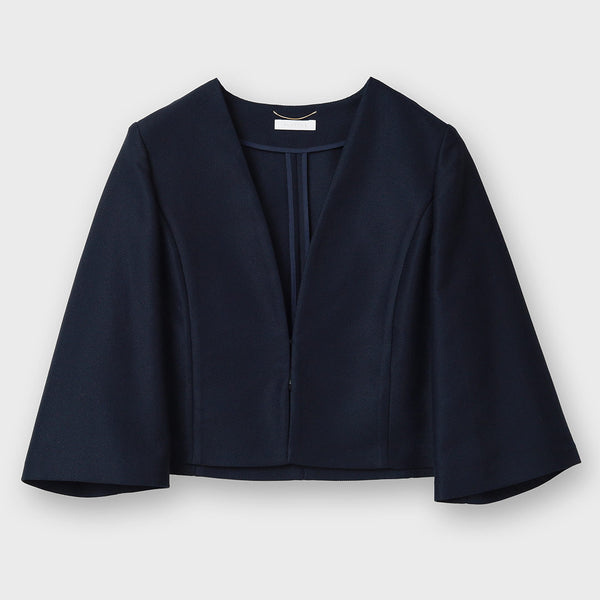 ノーカラーのすっきりとした衿元が顔まわりをシャープに見せ、ワンピースやスカートにも合わせやすいボレロ丈。