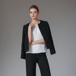 ラインに沿った美しいシルエットでコンパクトに仕上げたノーカラージャケット。