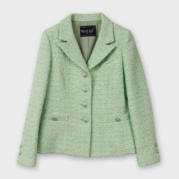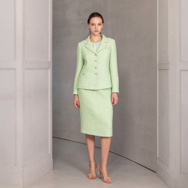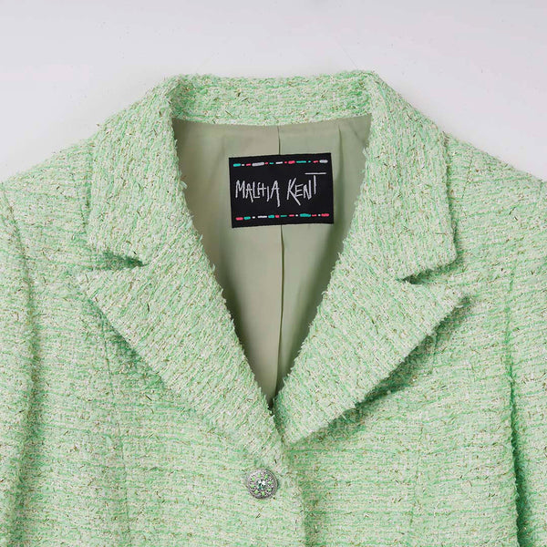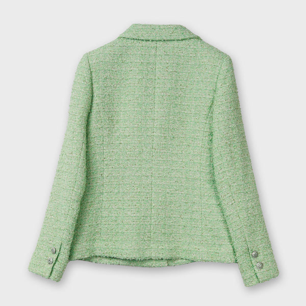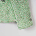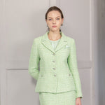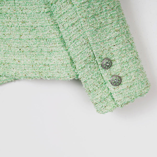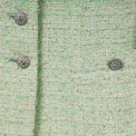 様々なライトグリーンの意匠糸とゴールドラメ糸を織り込んだ華やかなファンシーサマーツイード。