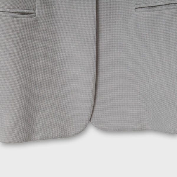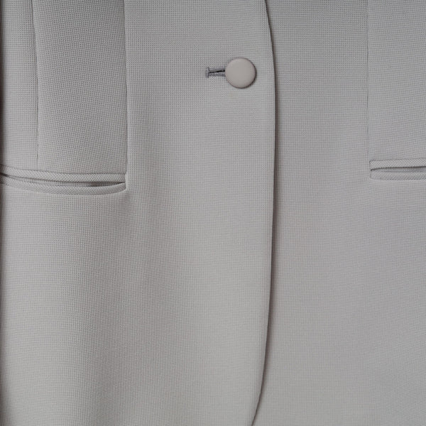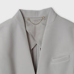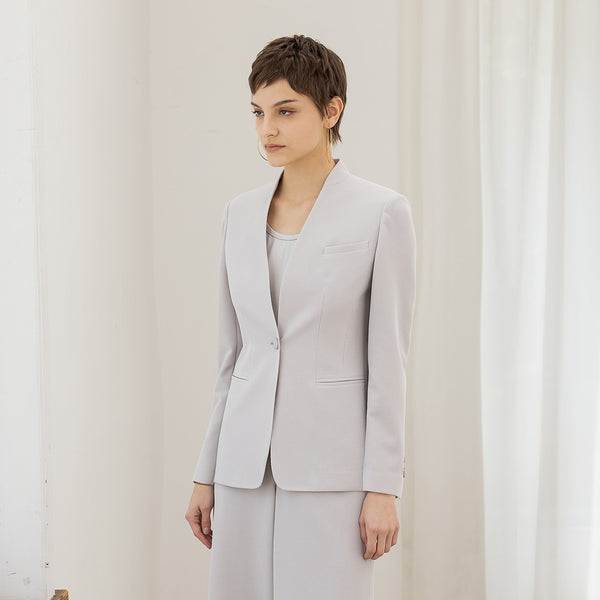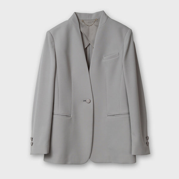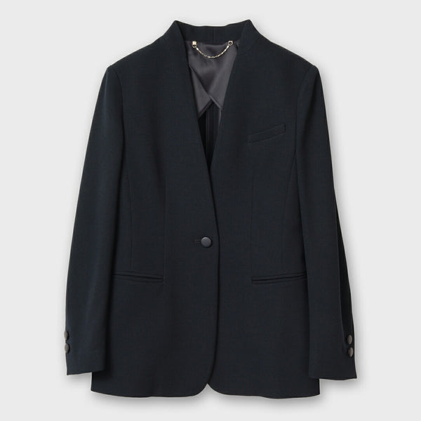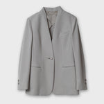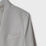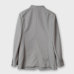 後ろの衿元が少しスタンドになっているノーカラージャケットです。