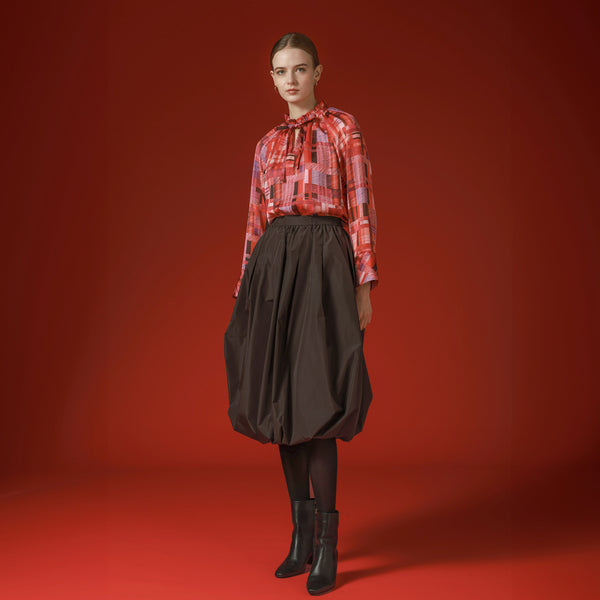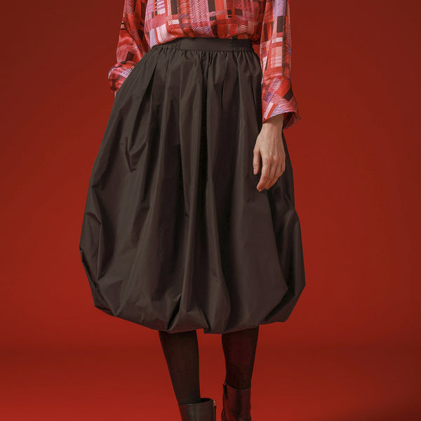 ギャザーとタックをバランス良く配し、裾に向けてバルーン形状に仕上げたスカートです。