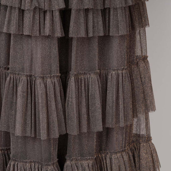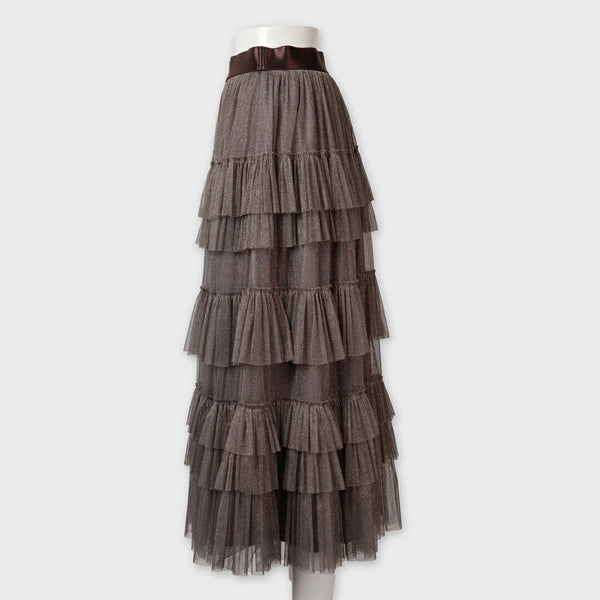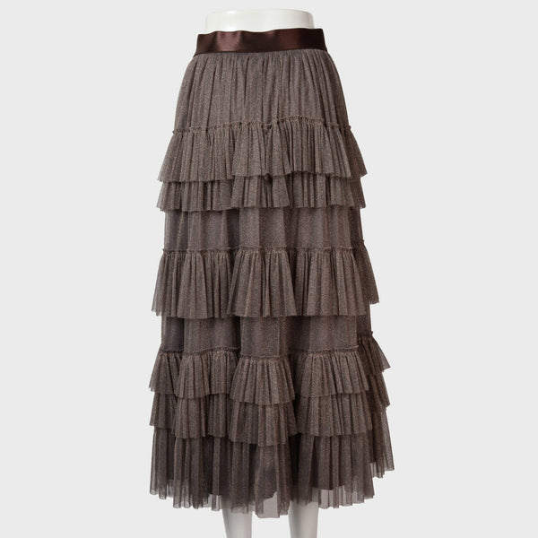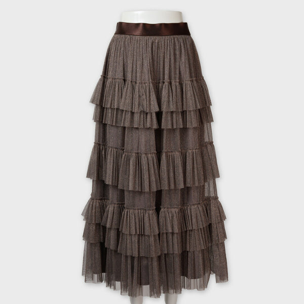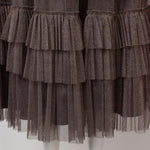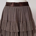 6段のギャザーを寄せたパーツを土台のチュールにバランスよく配し、ティアード状に仕上げたチュールスカートです。