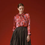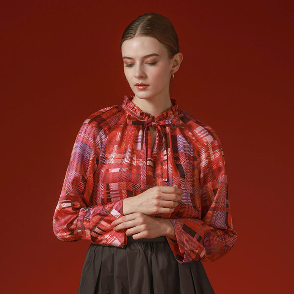 スタンドカラーの上にフリルをつけた、フロントスリット開きのデザイン。