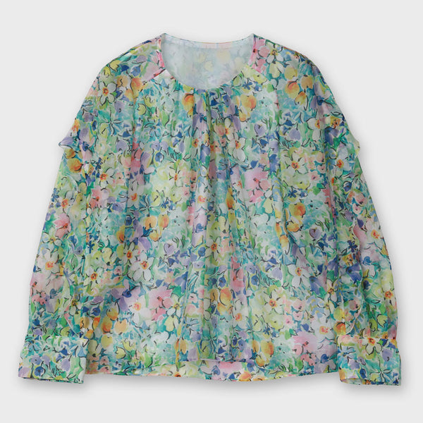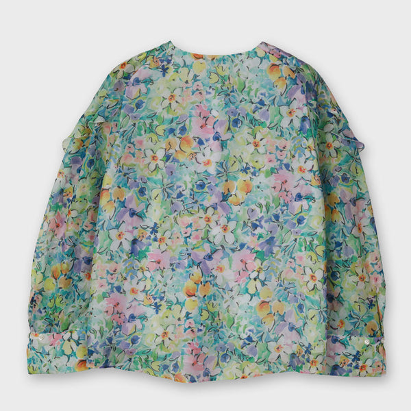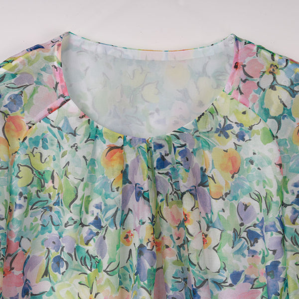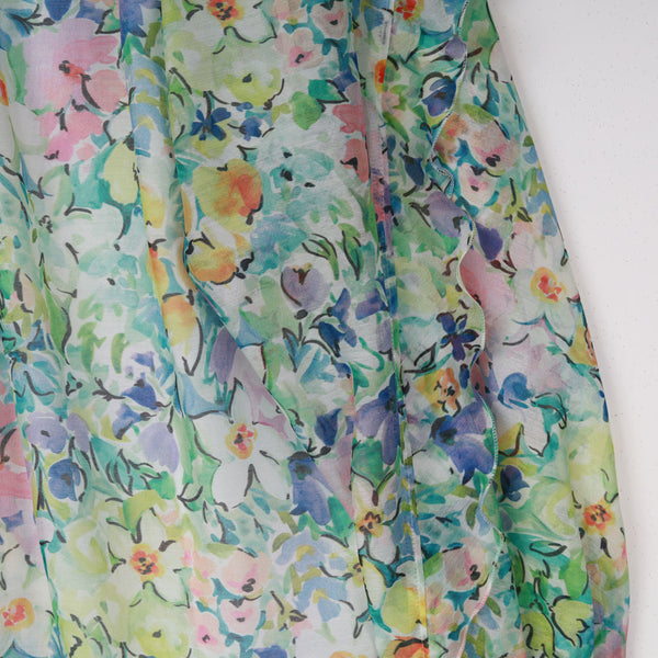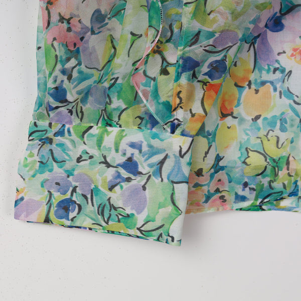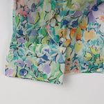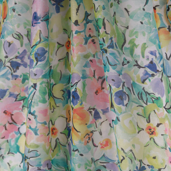 柔らかなポリエステルのオーガンジーにマルチカラーの花柄をプリントしました。