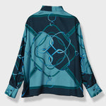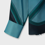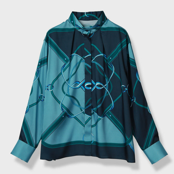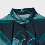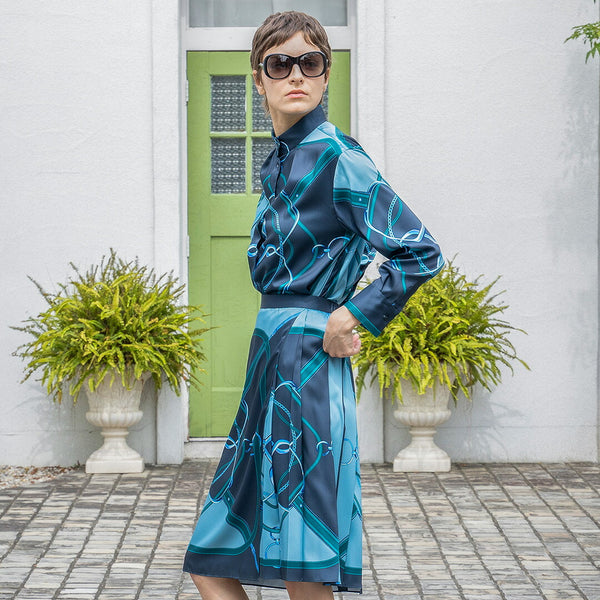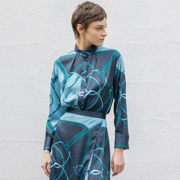 襟元からタックを放射線状に入れて表情を出した前開きブラウスで、同じシリーズのスカートと組み合わせてインしたり、無地のパンツと合わせてアウトでもバランス良くお召し頂けます。