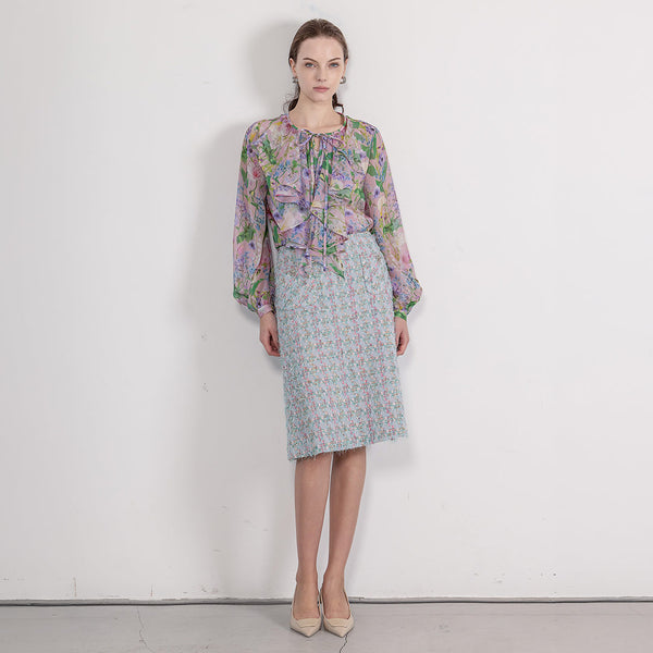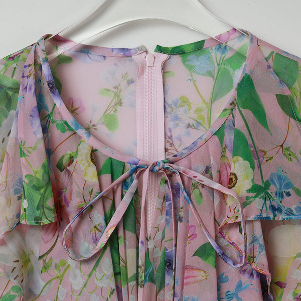 高級感のあるシルクシフォンジョーゼットに、春らしいマギーオリジナルのフラワープリントを表現しました。