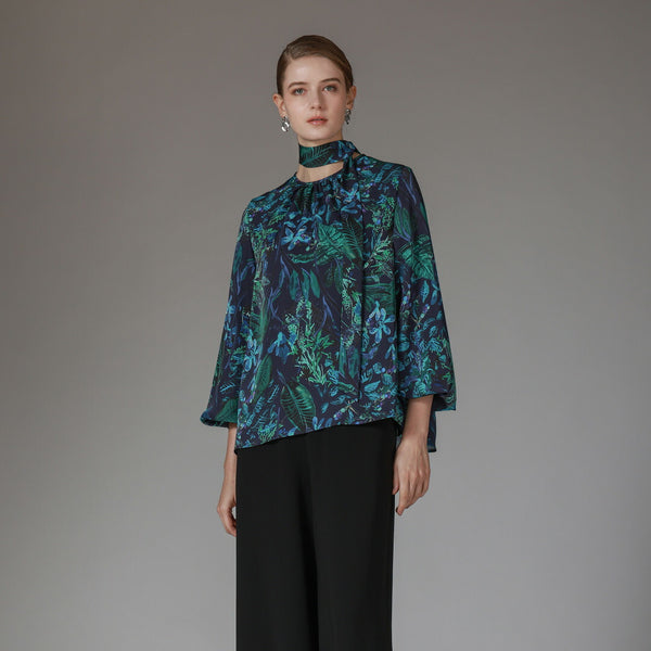 生地は、福井産のシルクライクなポリエステルで、程良い落ち感と反発感を兼ね備えた素材にプリントしました。