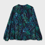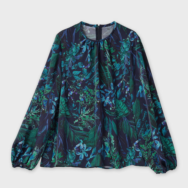 襟元の細かいギャザーが優しい印象のノーカラーブラウス。