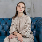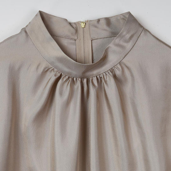 低めのスタンドカラ-にギャザ-を程良く入れ、優しい印象を演出。
