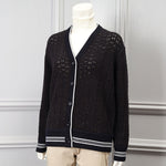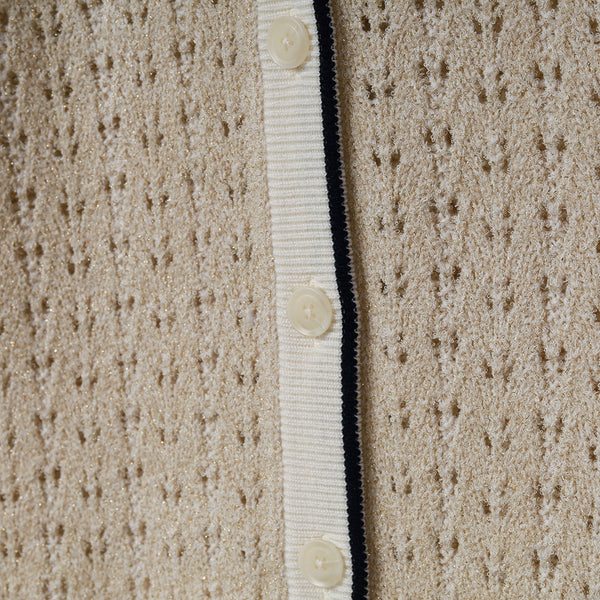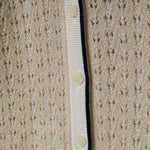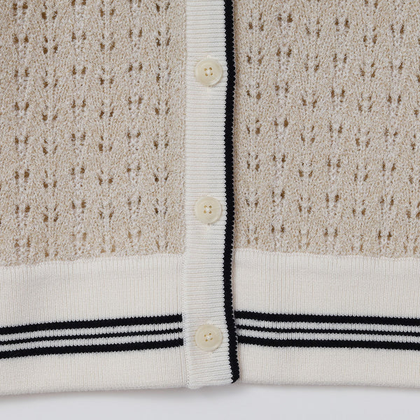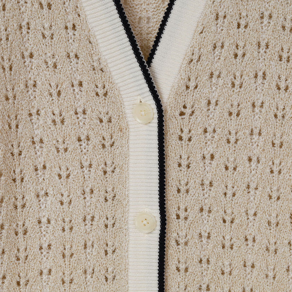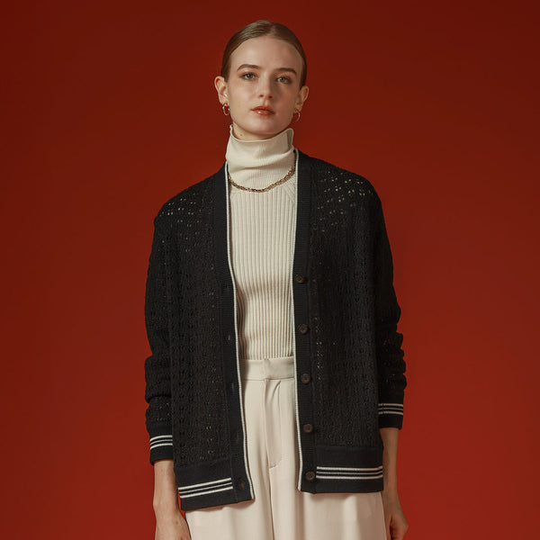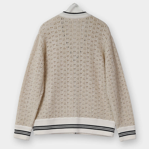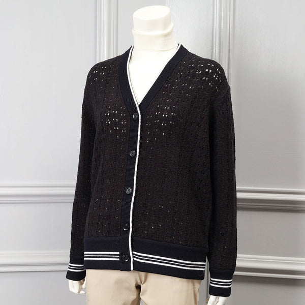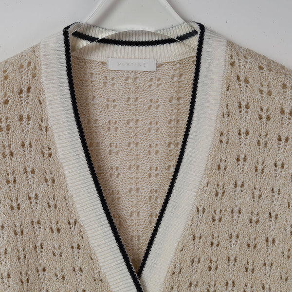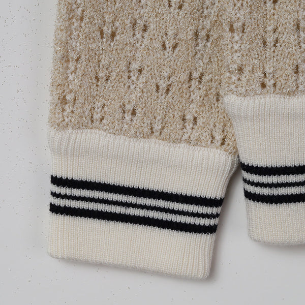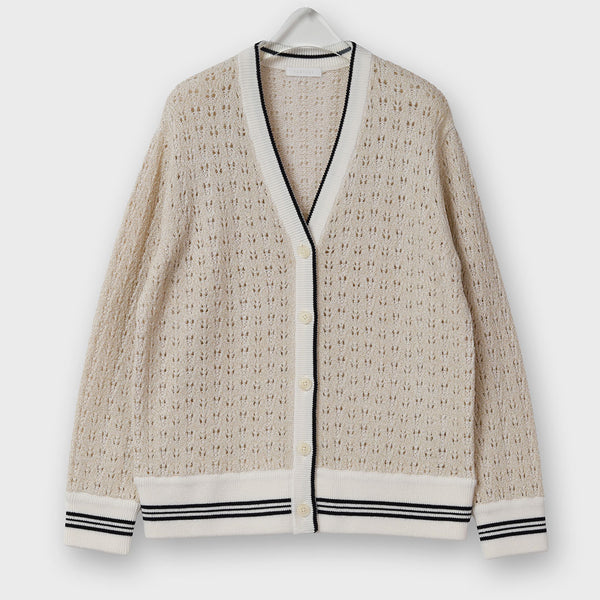 ライン入りのトラッドなデザインですが、編地を透かし編みにしているので、ほんのり甘さのある雰囲気に仕上げています。