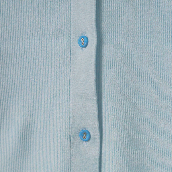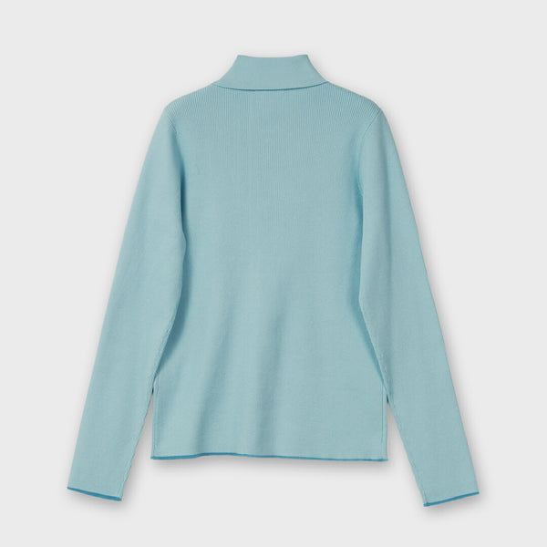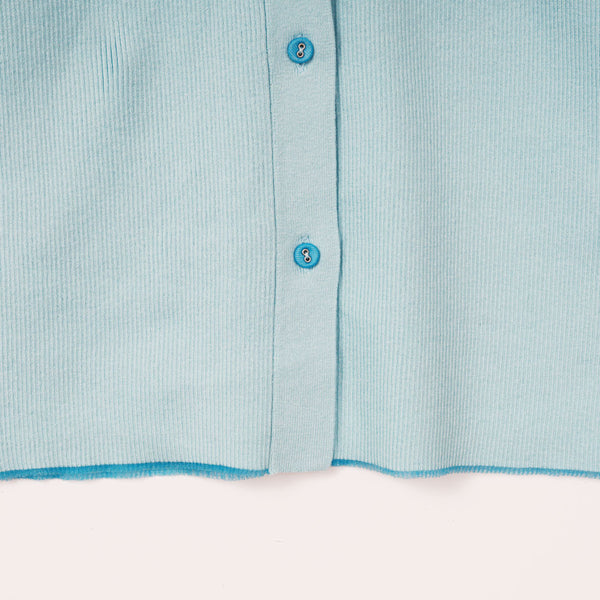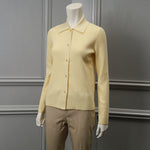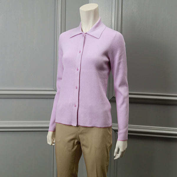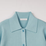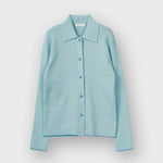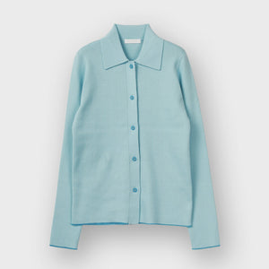 衿付きニットカーディガンは、羽織りとしてだけではなく、前を閉めてシャツライクなスタイリングがおすすめです。