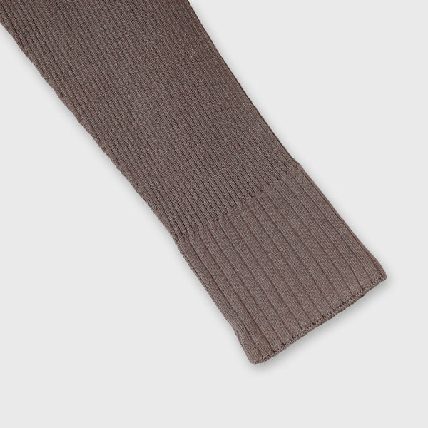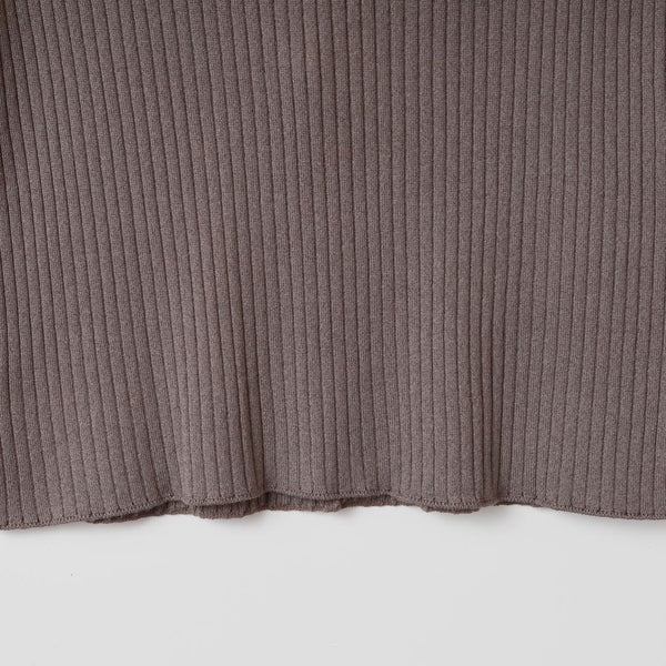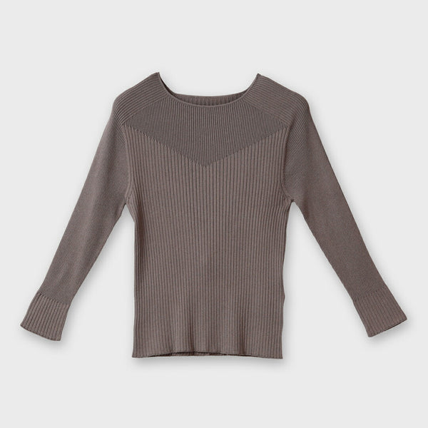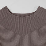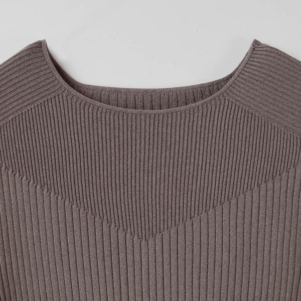身頃でリブの目数をかえてVのラインを作ることで、胸元を綺麗に見せる効果があります。