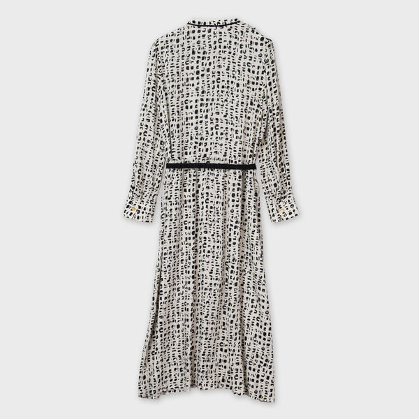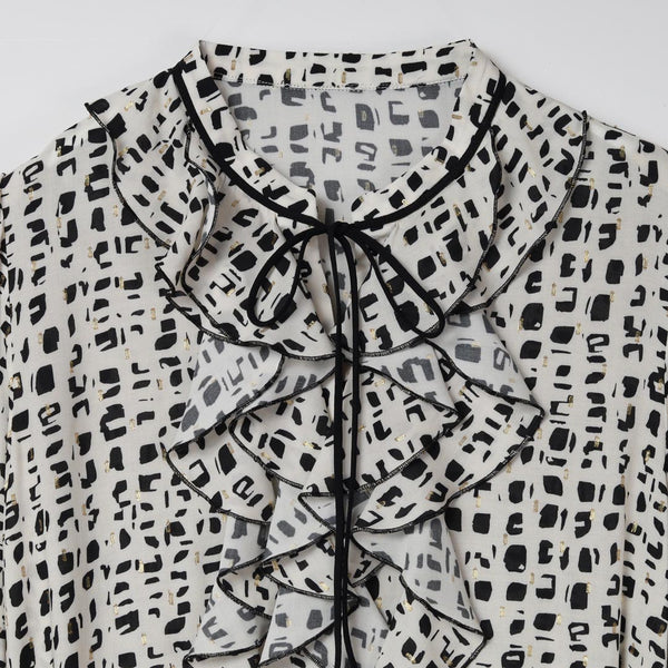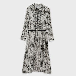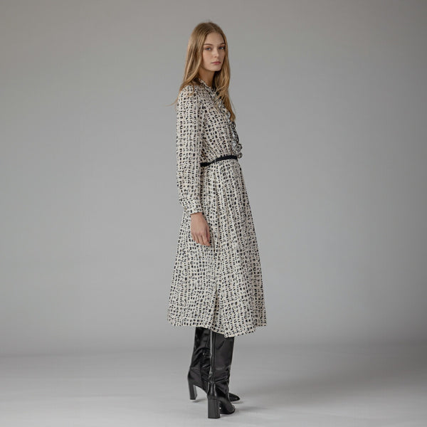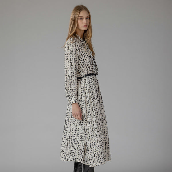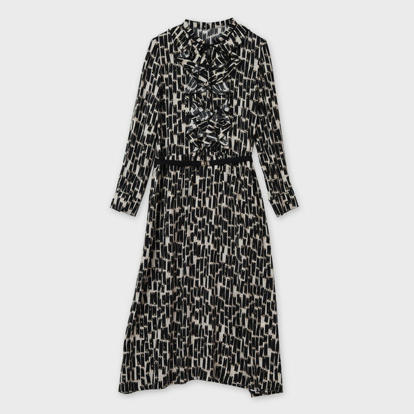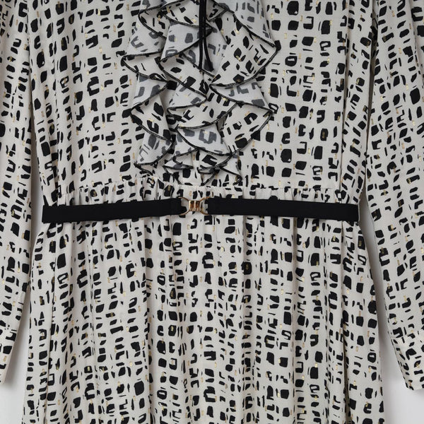 【手洗い可】ジオメトリック 2WAY ベルト付き フリル ネック ワンピース