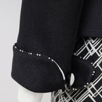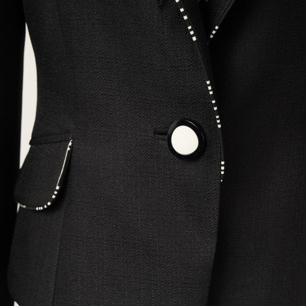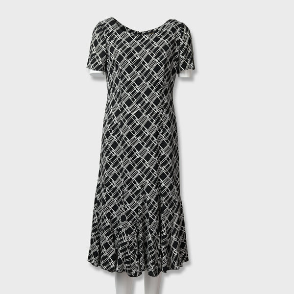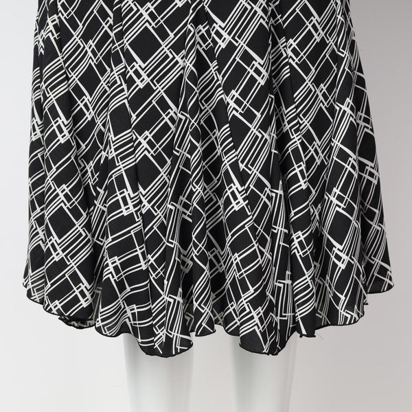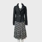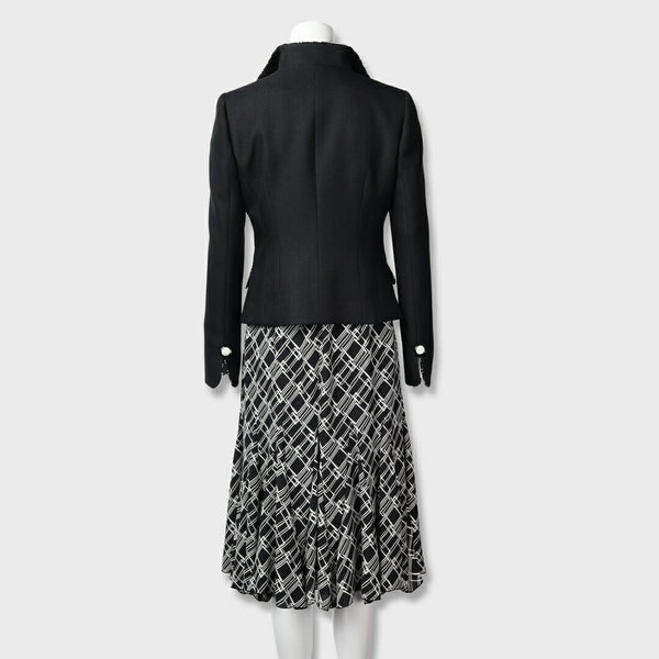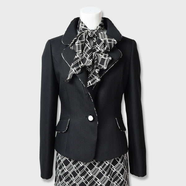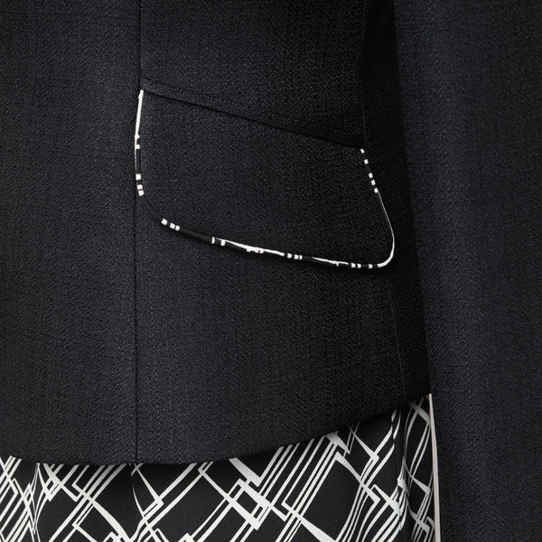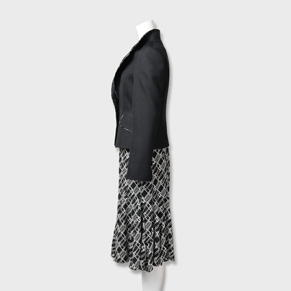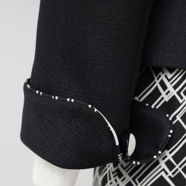 ジオメトリック柄の半袖ワンピースとテーラードジャケットのアンサンブルです。