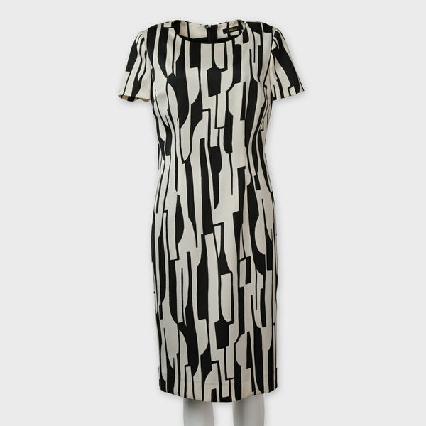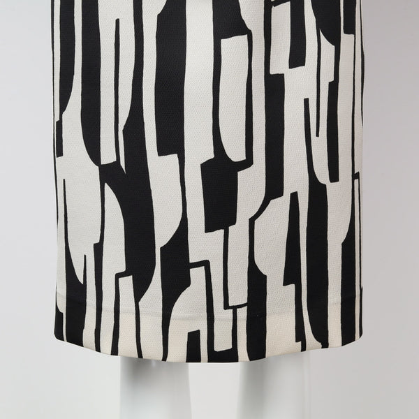 大胆な白黒の幾何学柄が印象的なノースリーブワンピースは、一枚で着ても主役級の存在感があります。