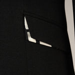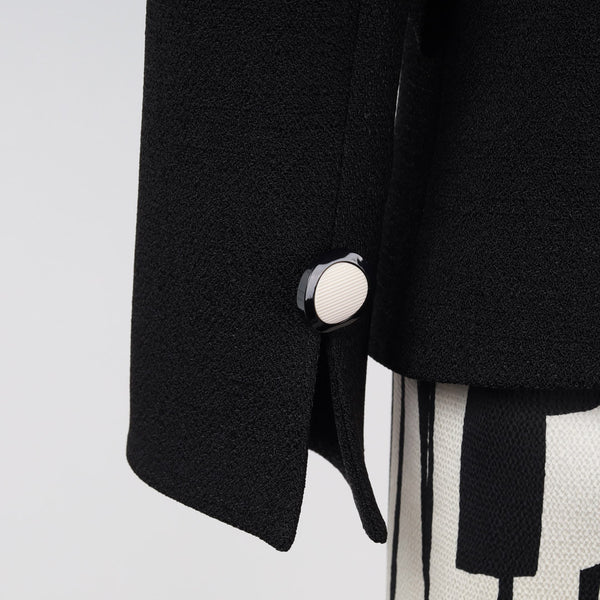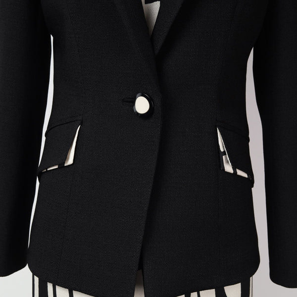 ジャケットは深いVネックとミニマルな比翼仕立てが特徴のシングルブレストです。