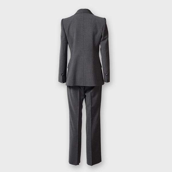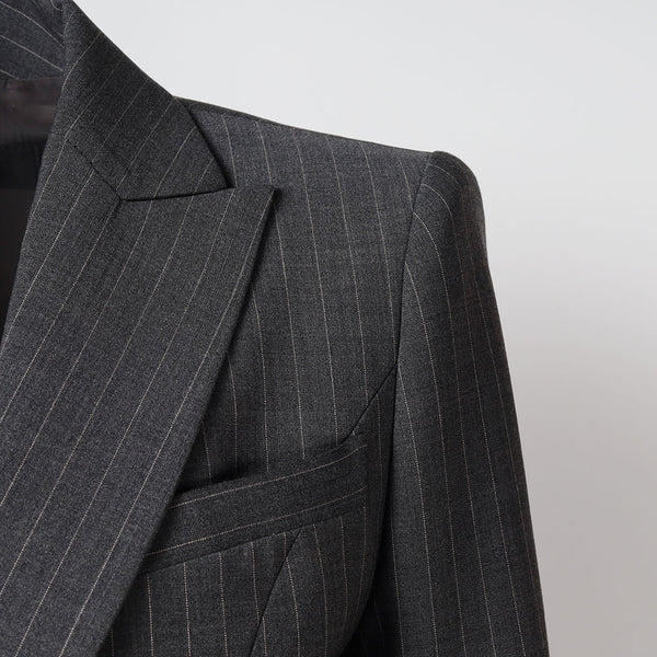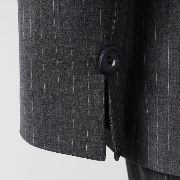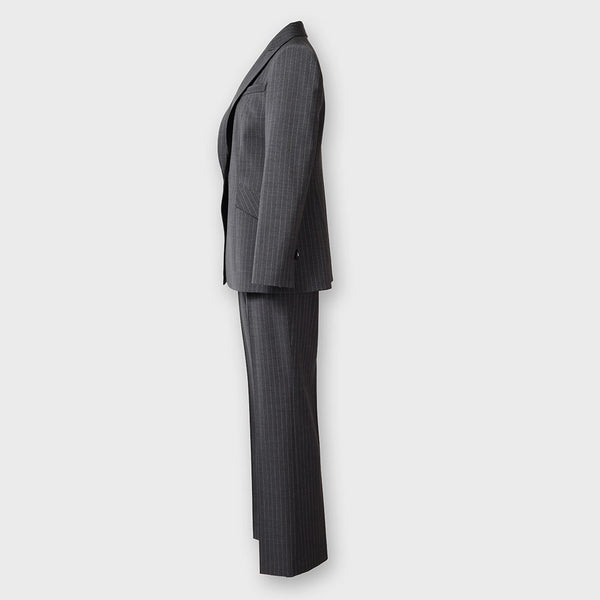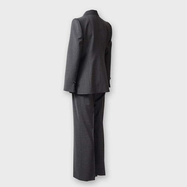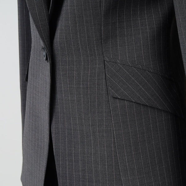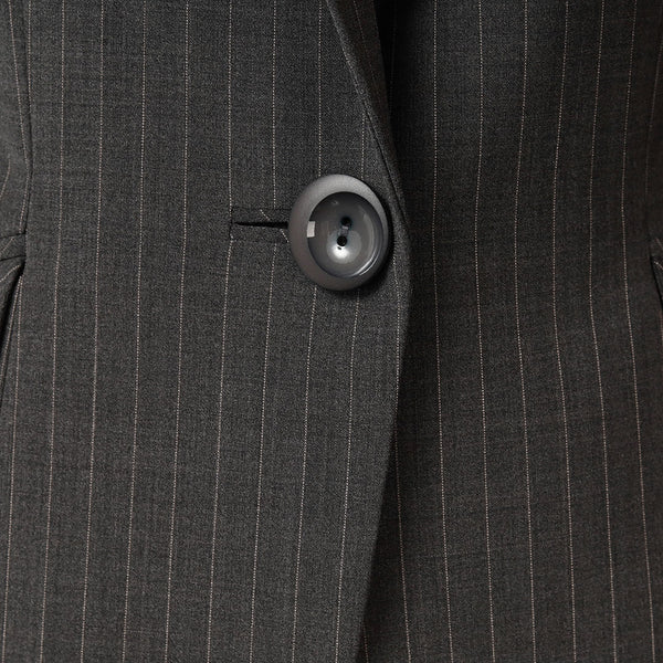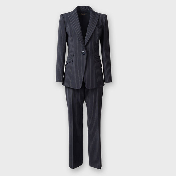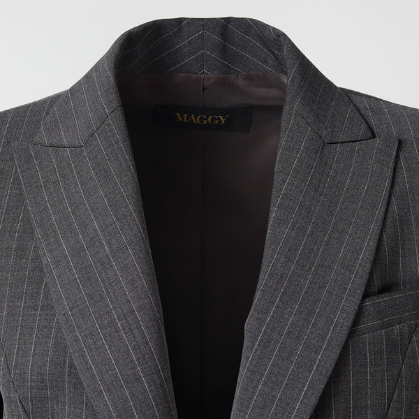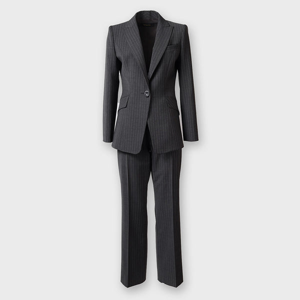 ピークドラペルが凛とした女性を醸すストライプ柄のセットアップスーツです。