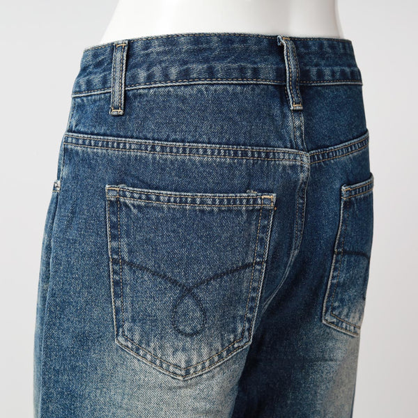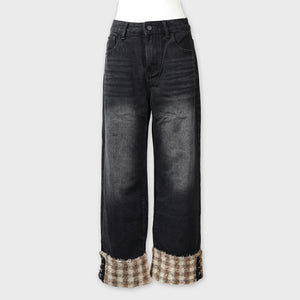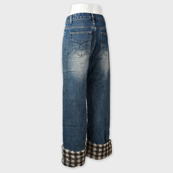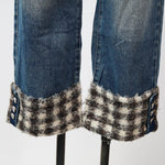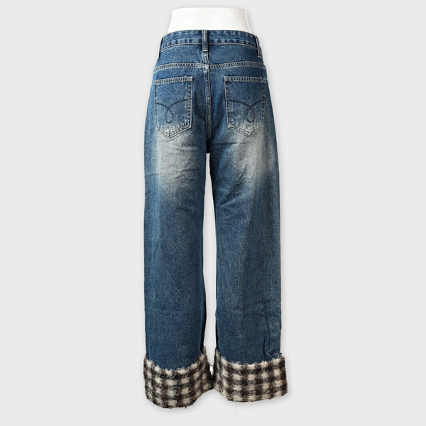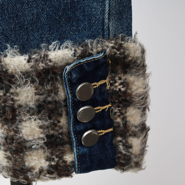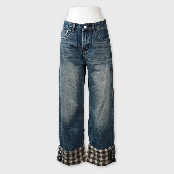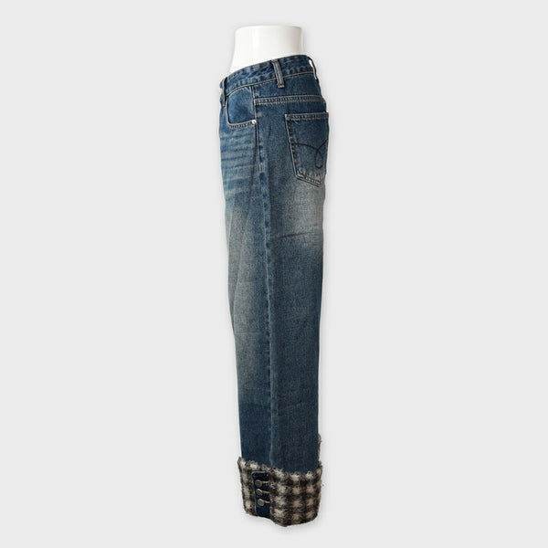 裾に施されたツイード風生の生地とシルバーボタンがアクセントのワイドデニム。