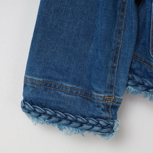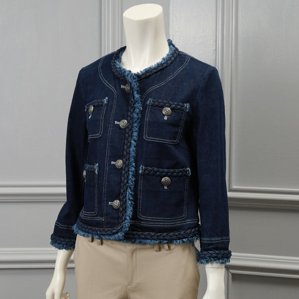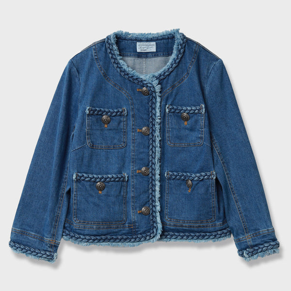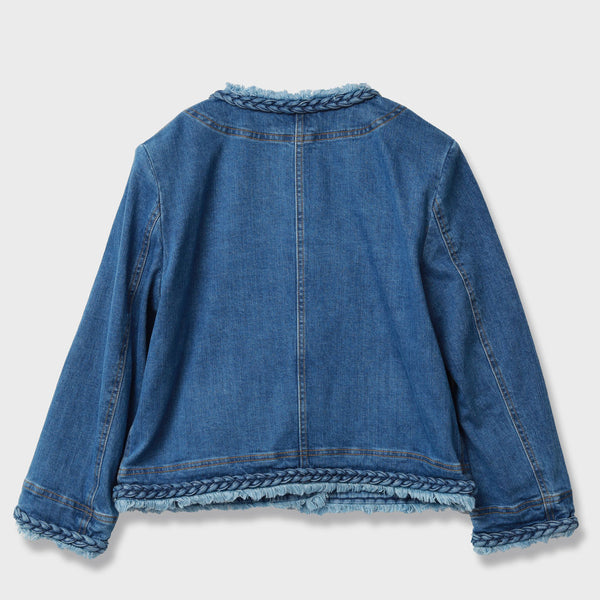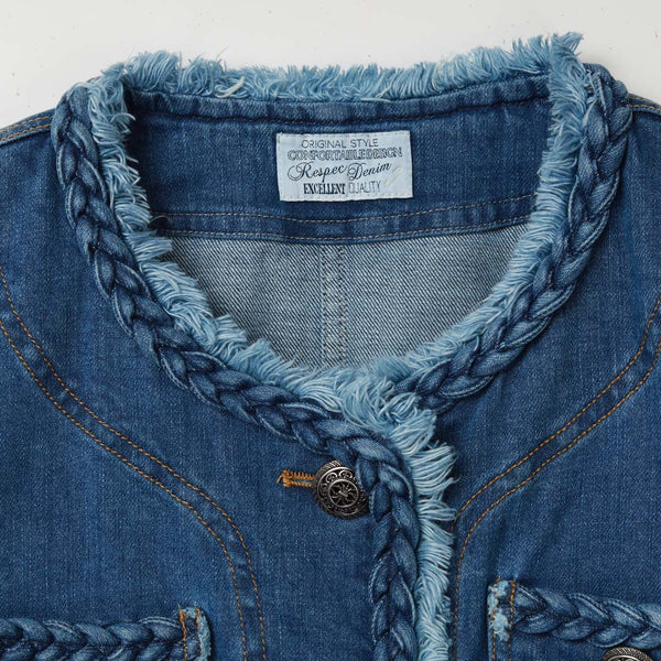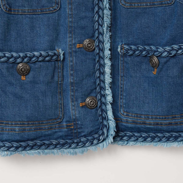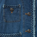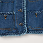 裾や襟元、ポケット部分に編み込みデザインが施されたデニムジャケット。