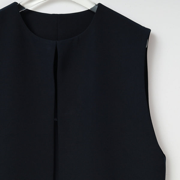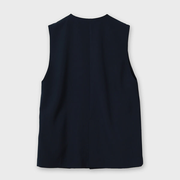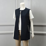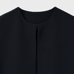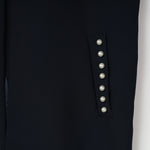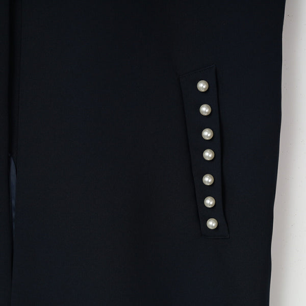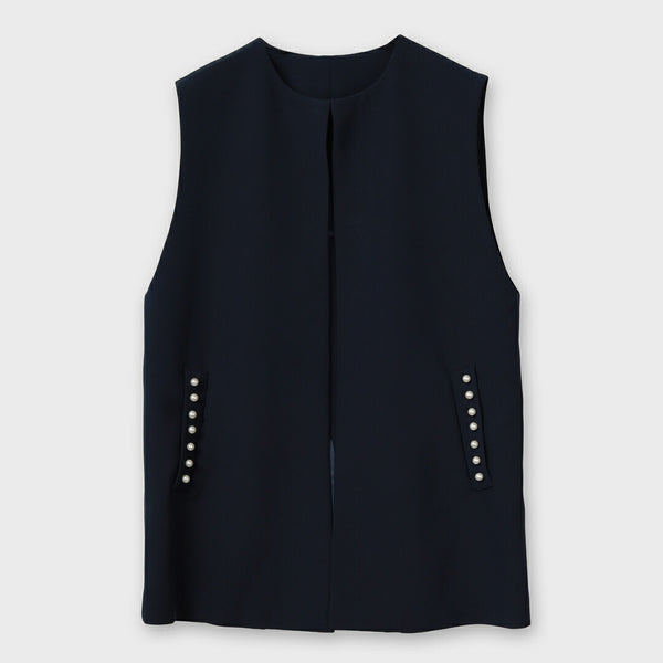 ポケットにあしらったパール装飾が、さりげない華やかさを添えるノーカラージレ。