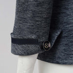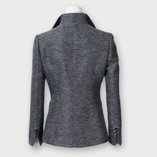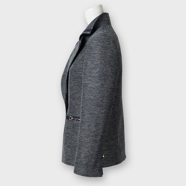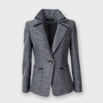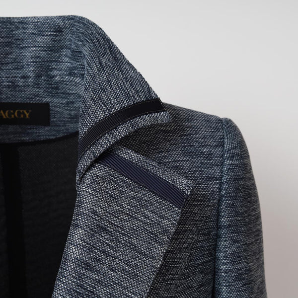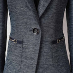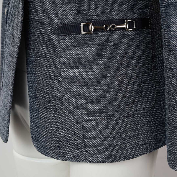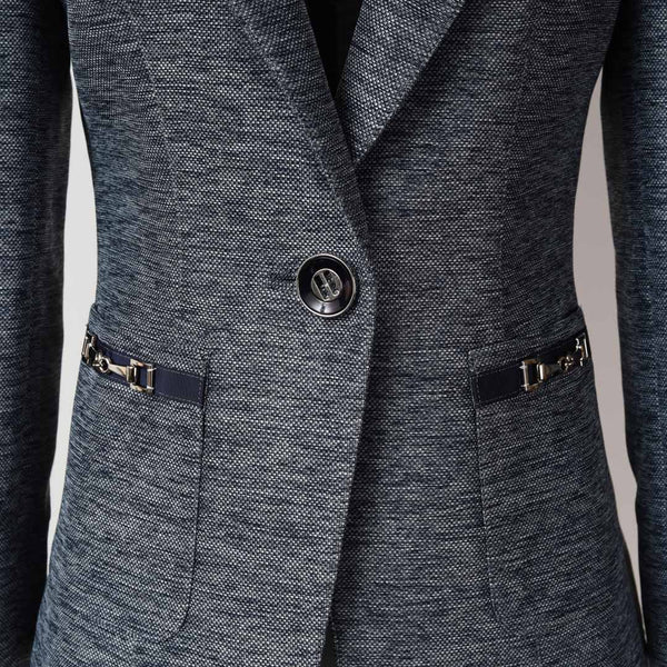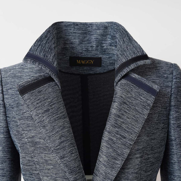 ネイビーのパイピングとレザー調のビットディテールがラグジュアリーな印象を添え、シングルボタンのすっきりとしたシルエットが体のラインを美しく演出します。