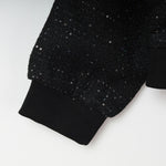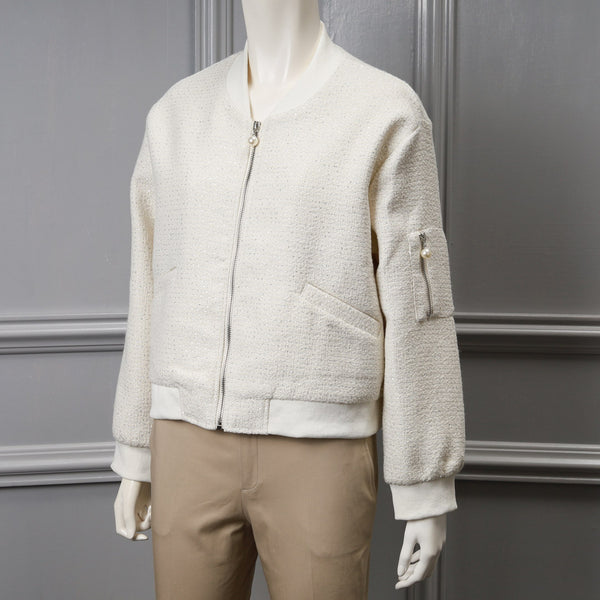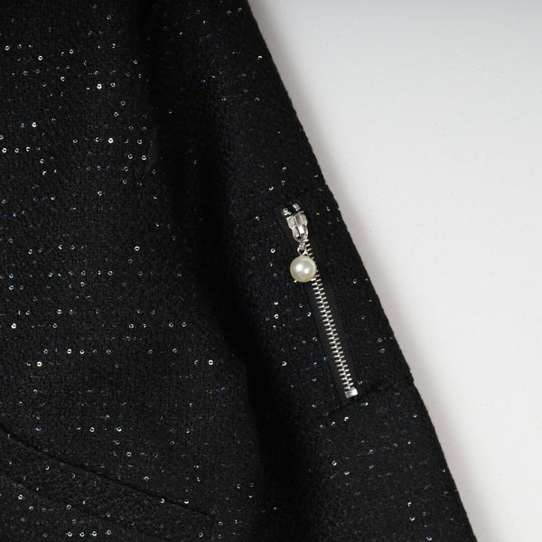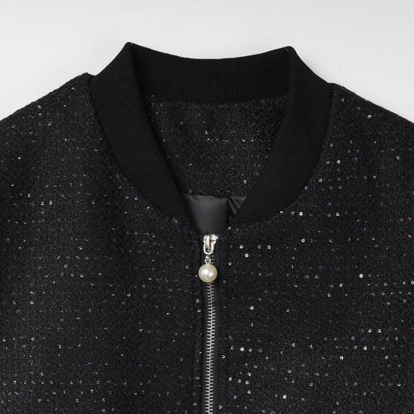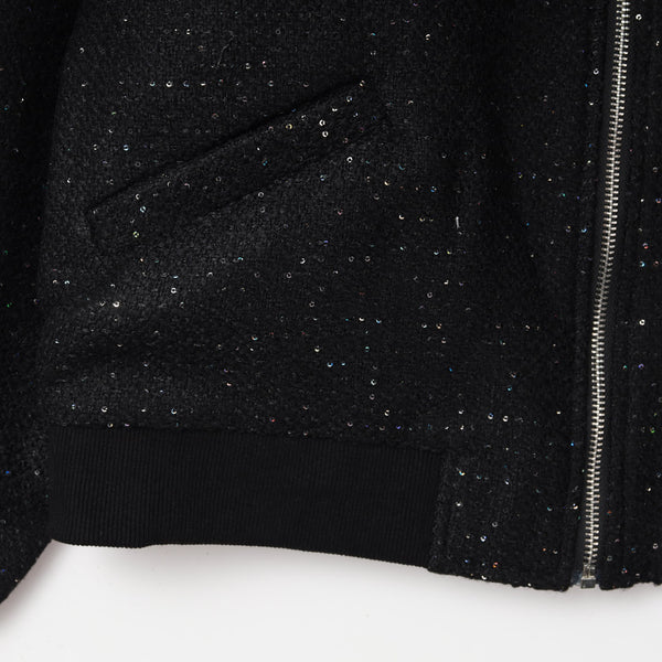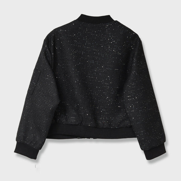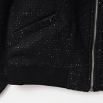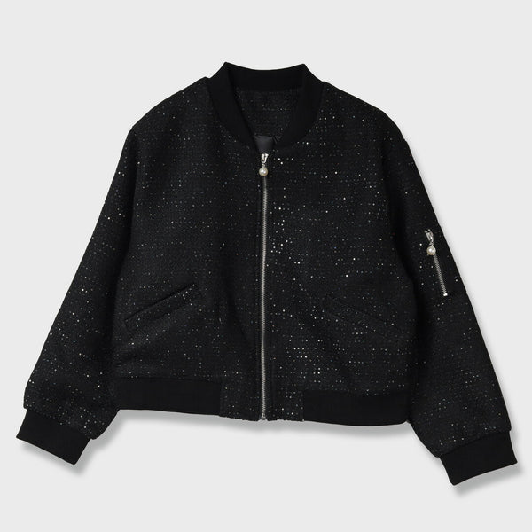 キラキラと輝く素材が目を引く、華やかなショートブルゾンです。