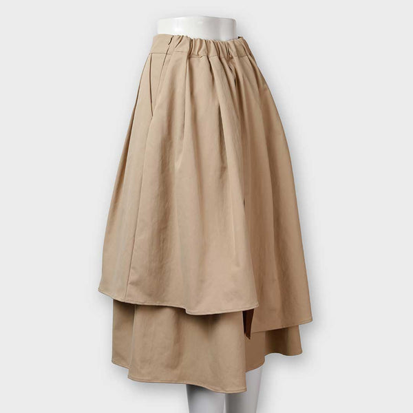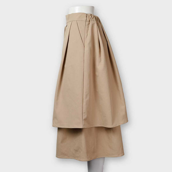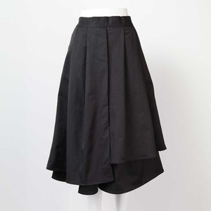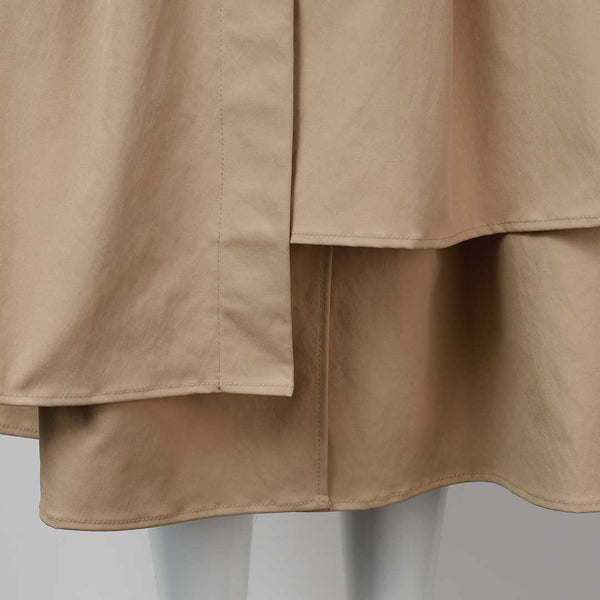 歩くたびに揺れる変形ヘムと、立体的なレイヤードデザインが、コーディネートに動きと奥行きをプラス。
