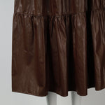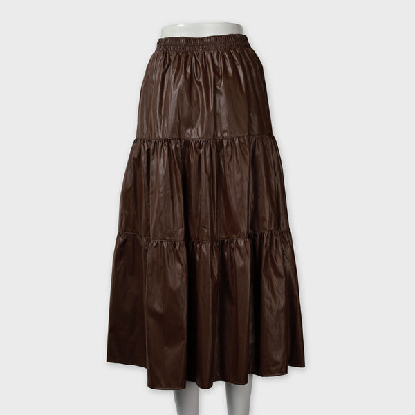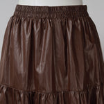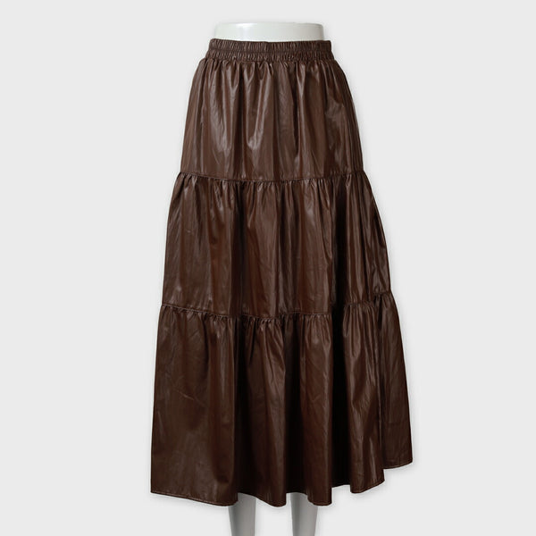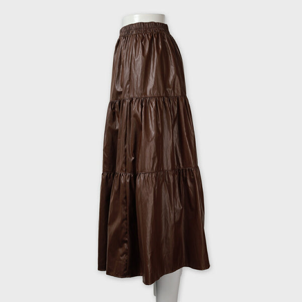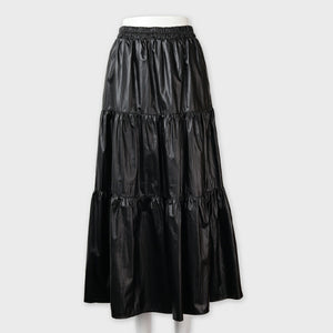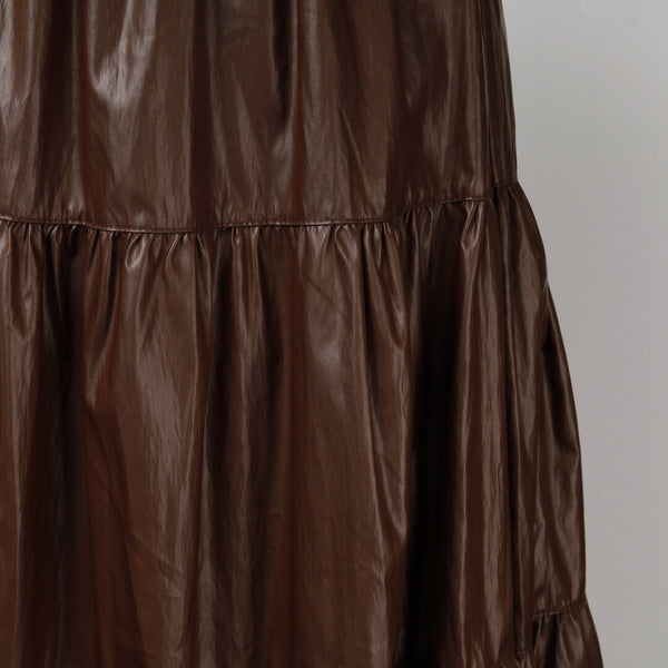 レザーのようなツヤのある素材感が魅力的な、ティアードスカートです。