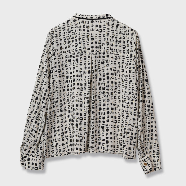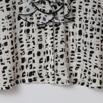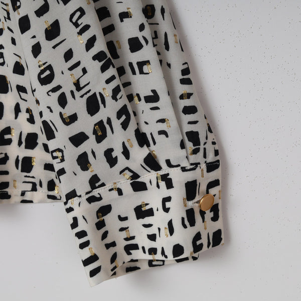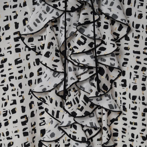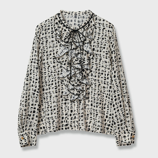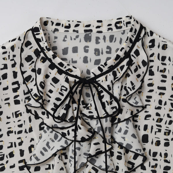 ランダムなドット柄とラメ糸が目を惹く、スタンドカラーのフリルブラウスです。