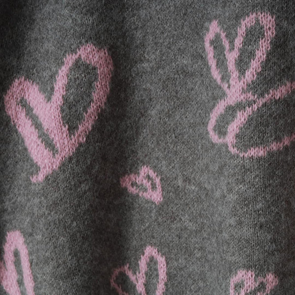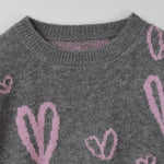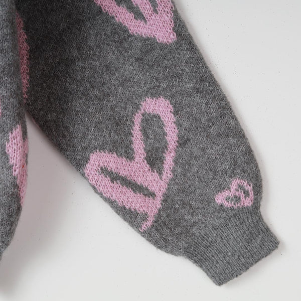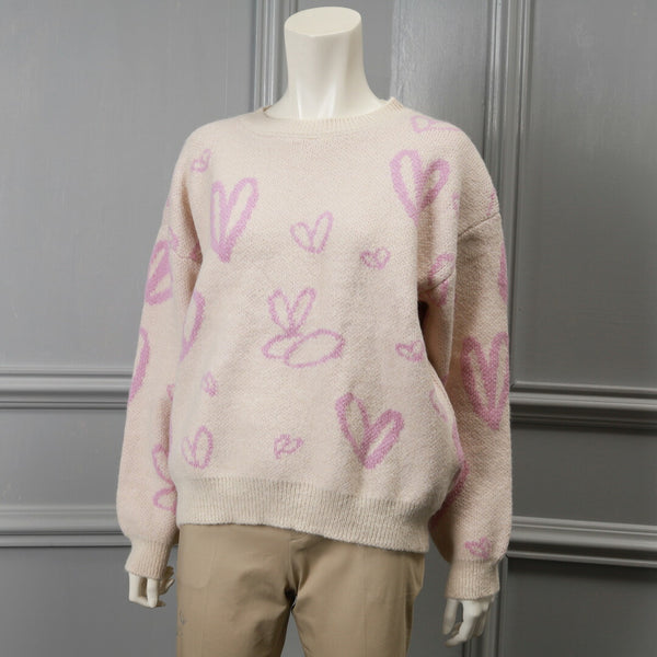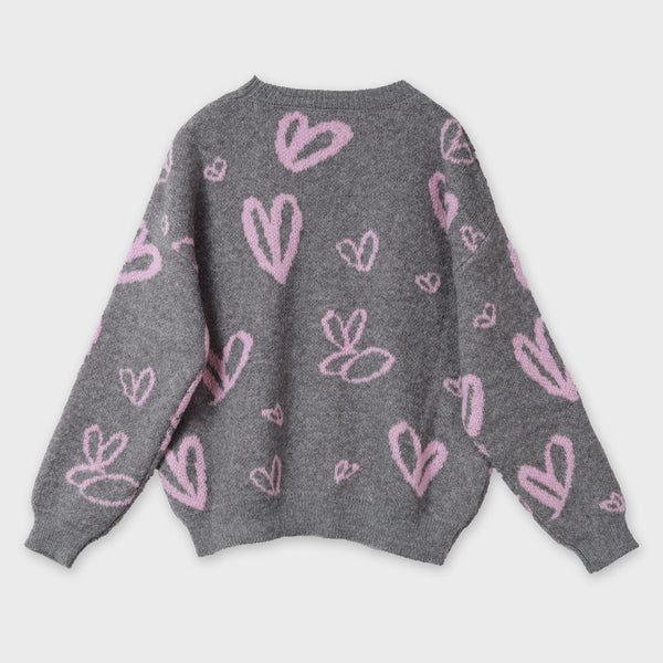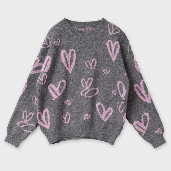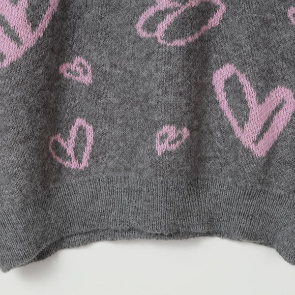 手書き風のハート柄がラフな雰囲気を演出するニットプルオーバー。程よく肉厚の柔らかいニット生地が気持ちの良い肌触りで、日常使いしやすいです。