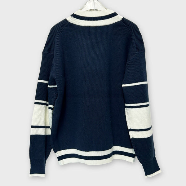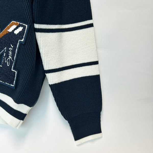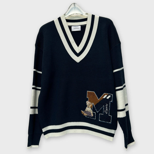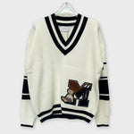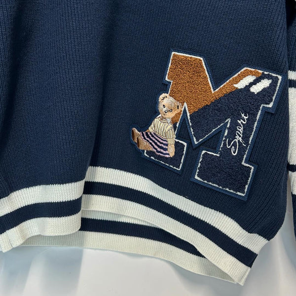 「M」のロゴとテディベアの刺繍が可愛らしいニットプルオーバー。