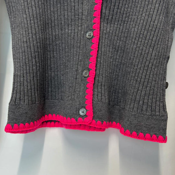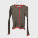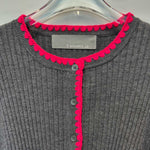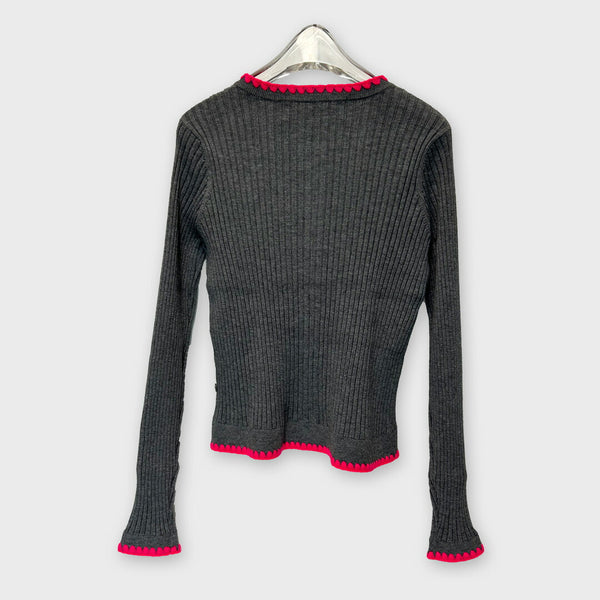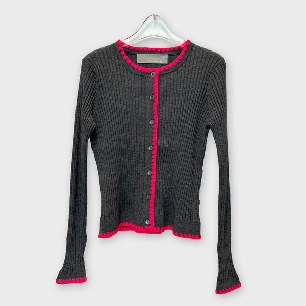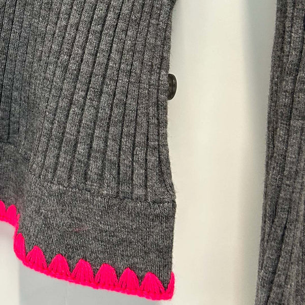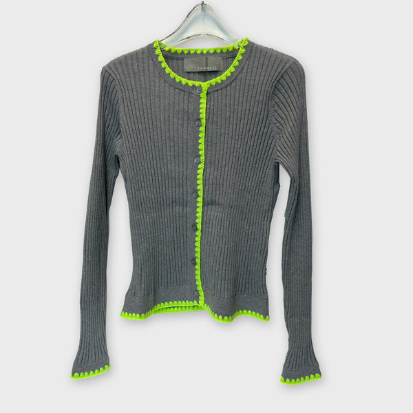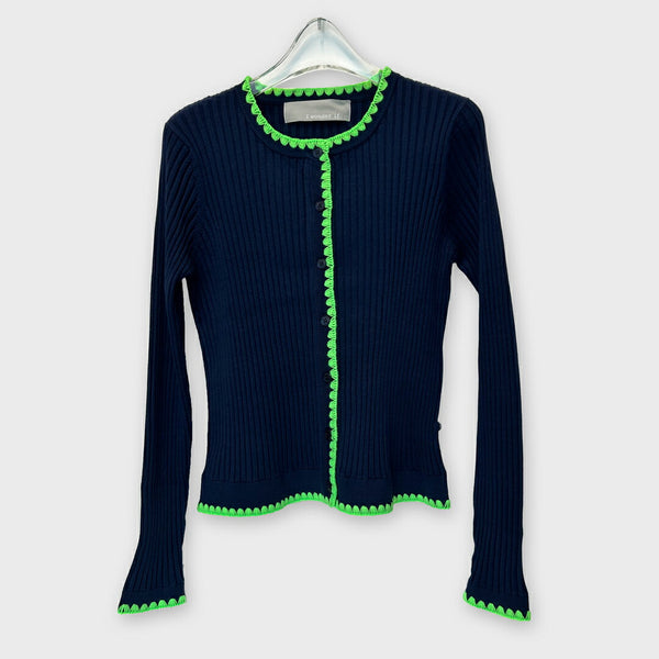 裾にスカラップ状のトリムがあしらわれているリブニットカーディガン。