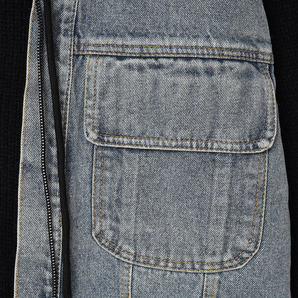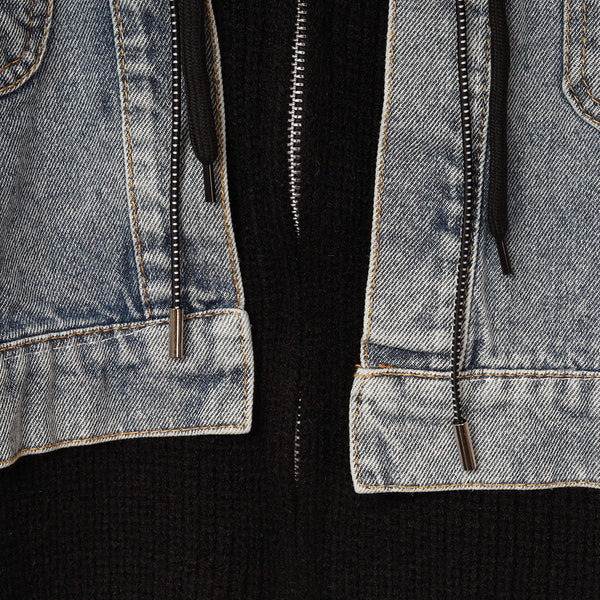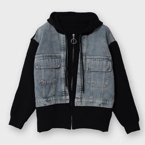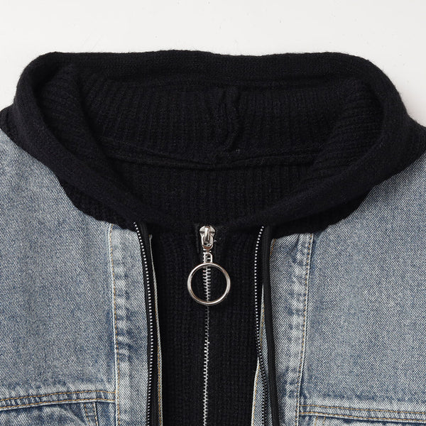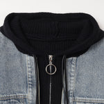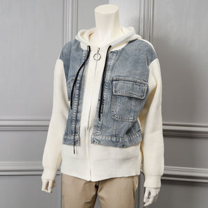 ニット素材の本体に本格的なデニム生地がドッキングされており、カジュアルながらもおしゃれな印象を与えます。