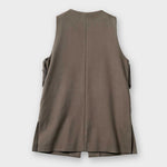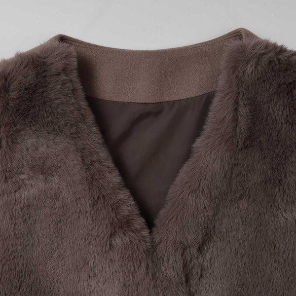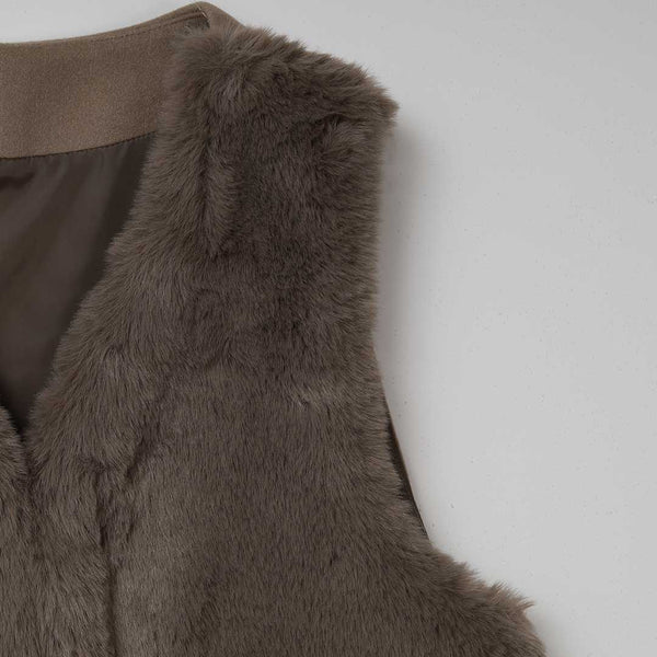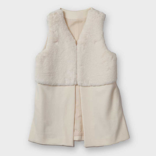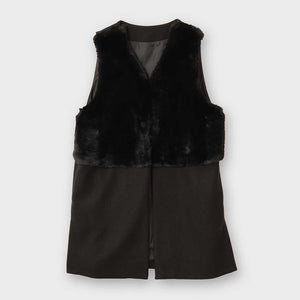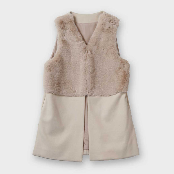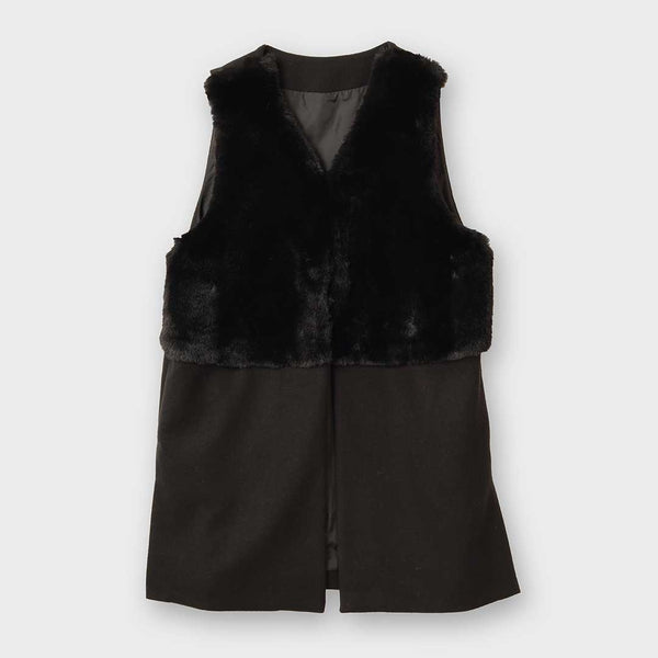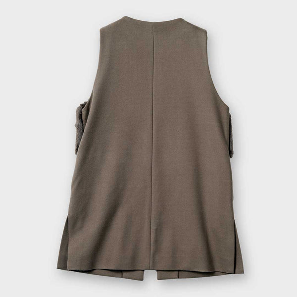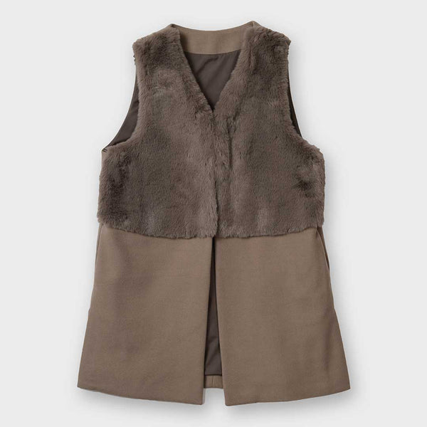 エコファーとウール調素材で切り替えた、表情豊かなコンビデザインのベスト。
