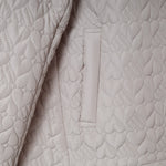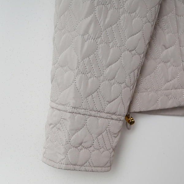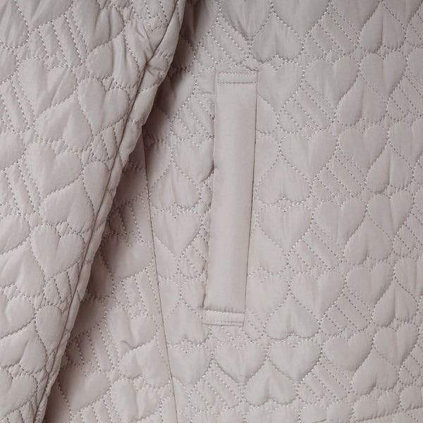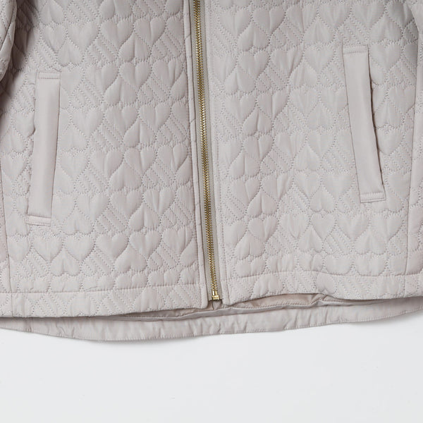 キルト部分はハート柄、リボンのドローストリングで、フェミニンなデザインディテール。