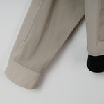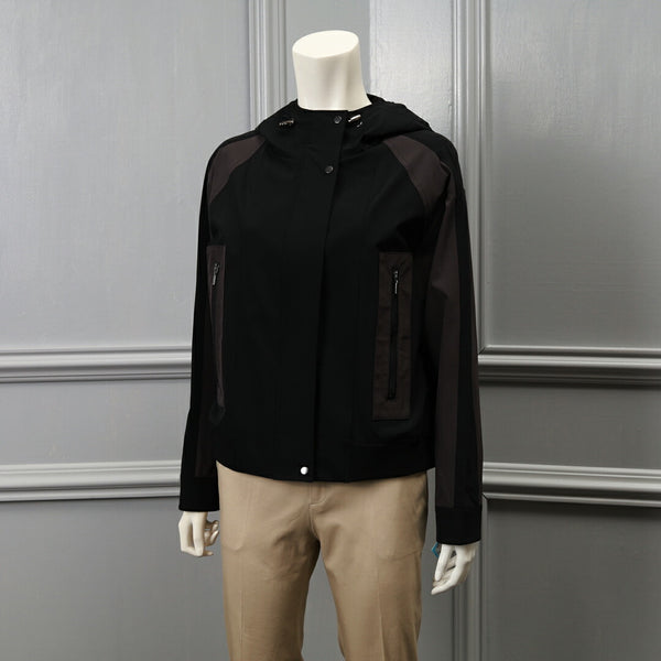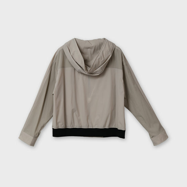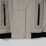 フロントの垂直なジッパーポケットや、裾と袖口の配色リブ、異素材の組み合わせが特徴的なデザインです。