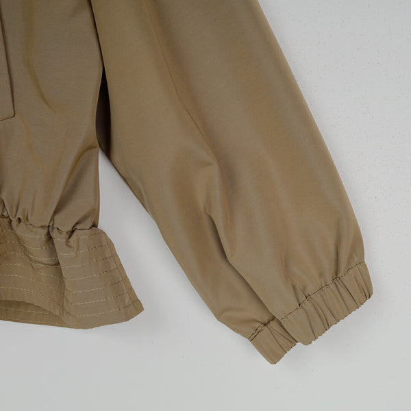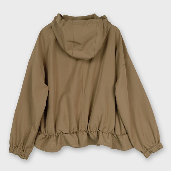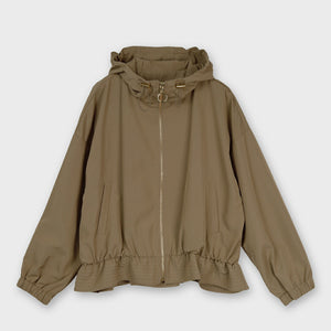 春先に活躍する軽い素材のフード付きブルゾン。