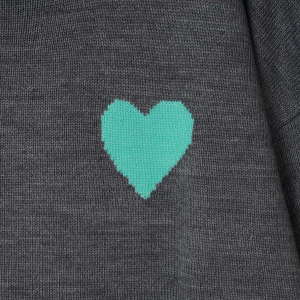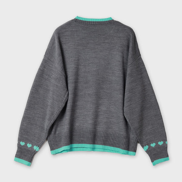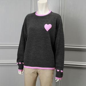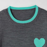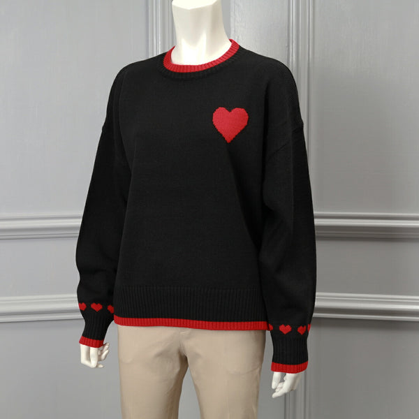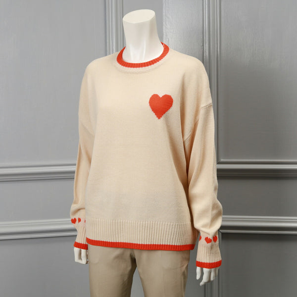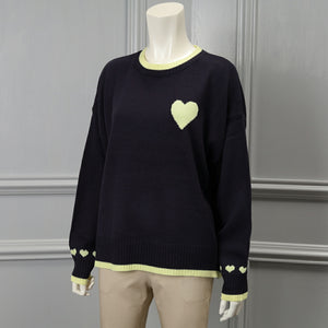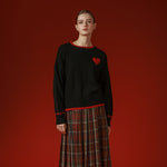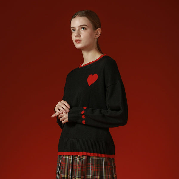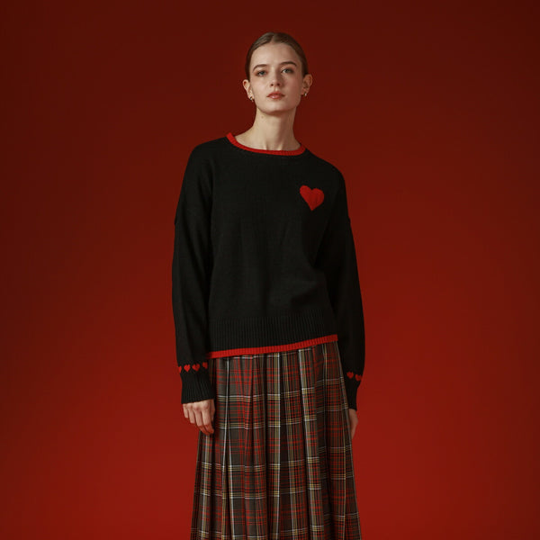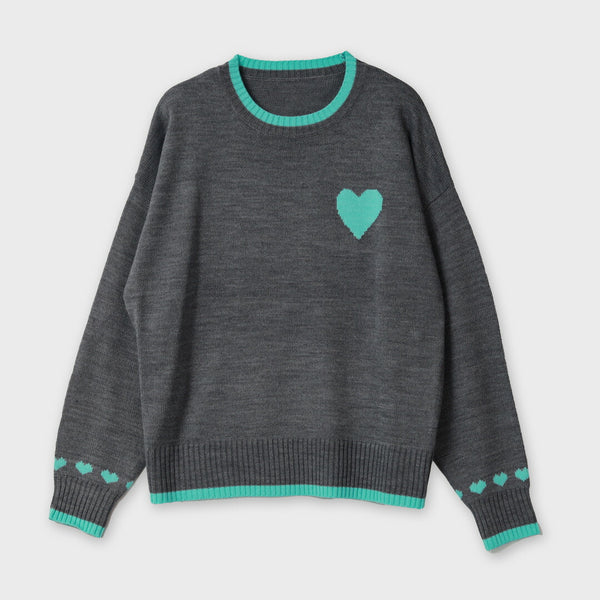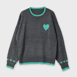 大きなハートモチーフと配色ラインが目を引く、遊び心のあるニットプルオーバーです。