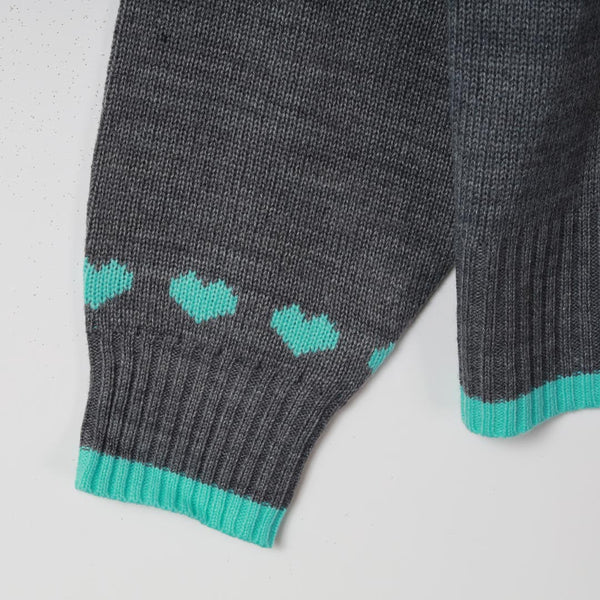 左胸の大きなハート模様と、袖口に並んだ小さなハート模様が、コーディネートの主役に。