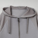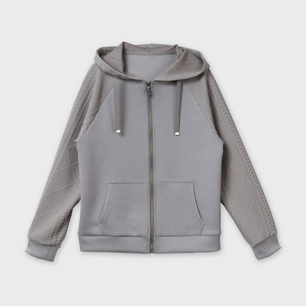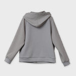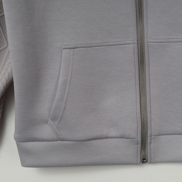 適度なハリ感とストレッチ性のあるダンボールニット素材を身頃に使用し、袖とフードの一部をポリエステルニットで切り替えています。