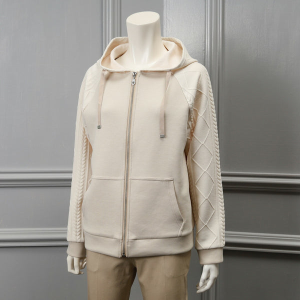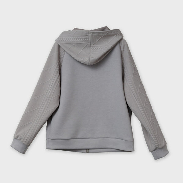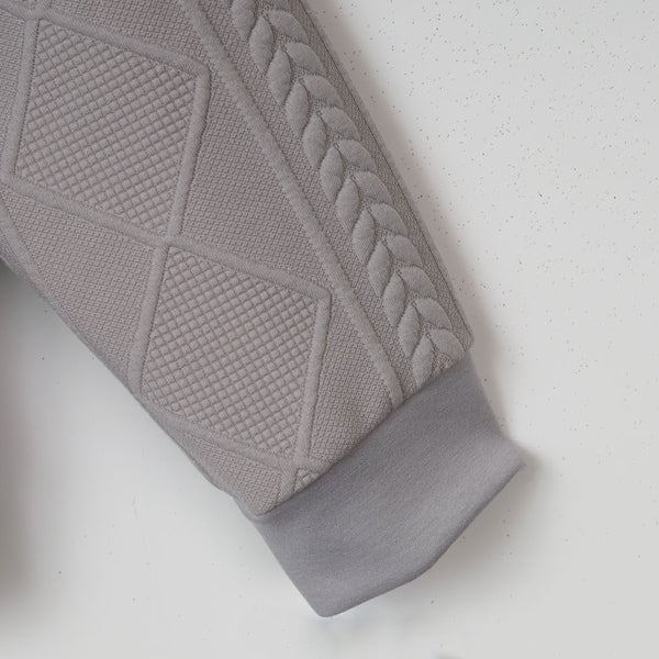 立体感のある袖: ニット部分にはケーブル柄が施されており、表面の立体感がデザインのアクセントになっています。