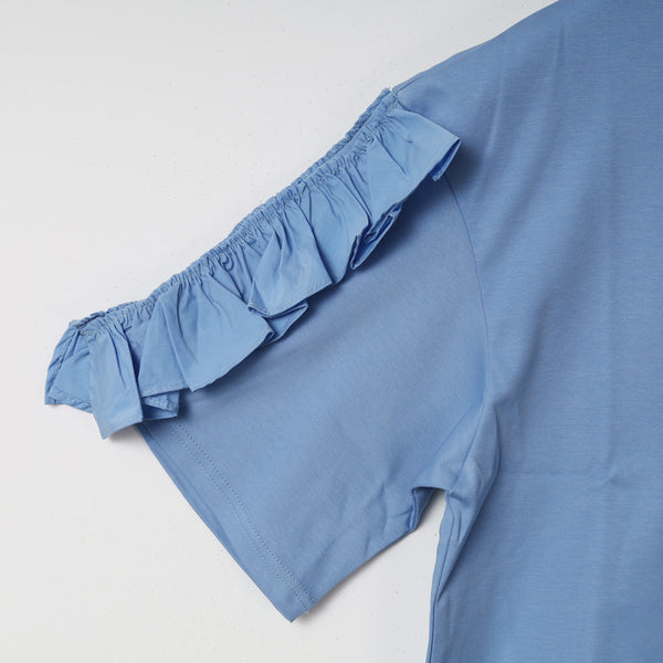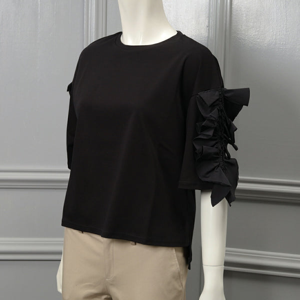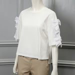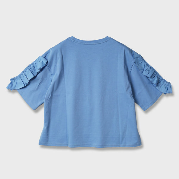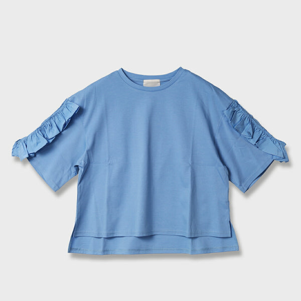 シンプルなボディに存在感のあるフリル袖を組み合わせ、一枚で着映えする華やかさを演出してくれます。