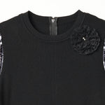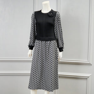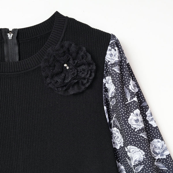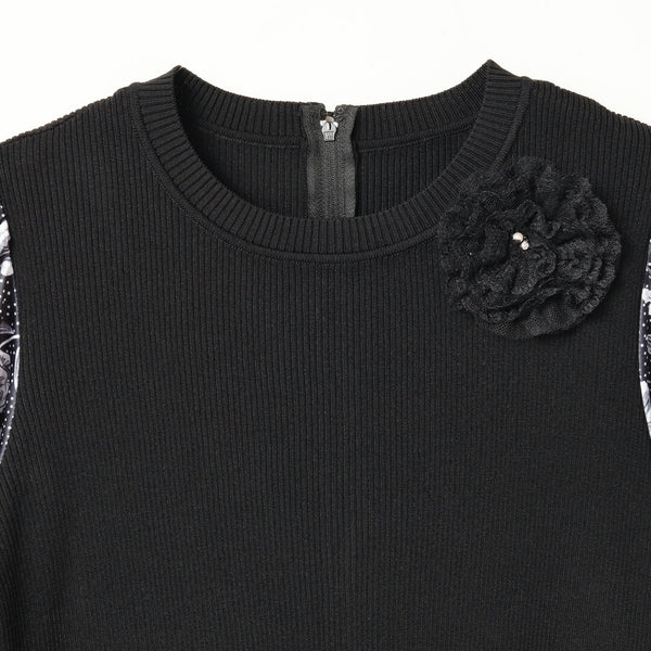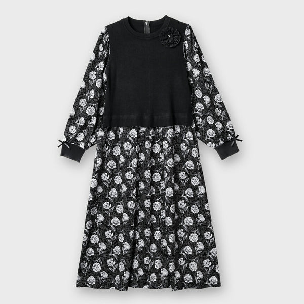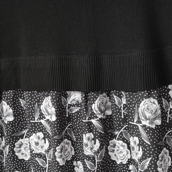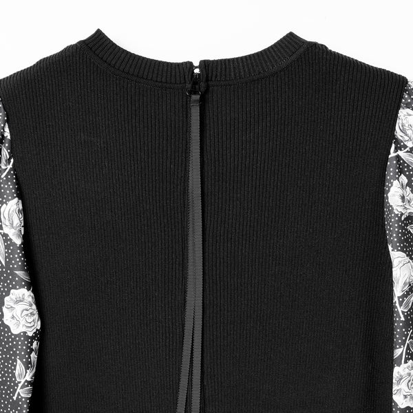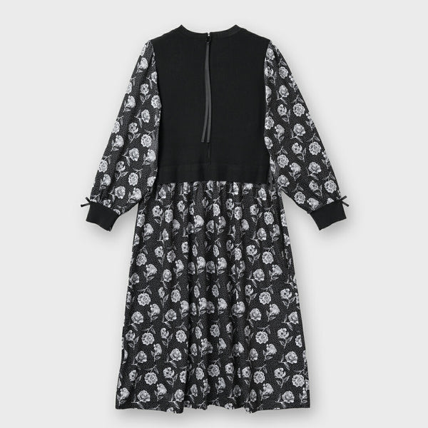 伸縮性のあるフラワープリントの生地とニットベスト風のドッキングワンピースはワンランク上の日常着を演出してくれます。
