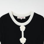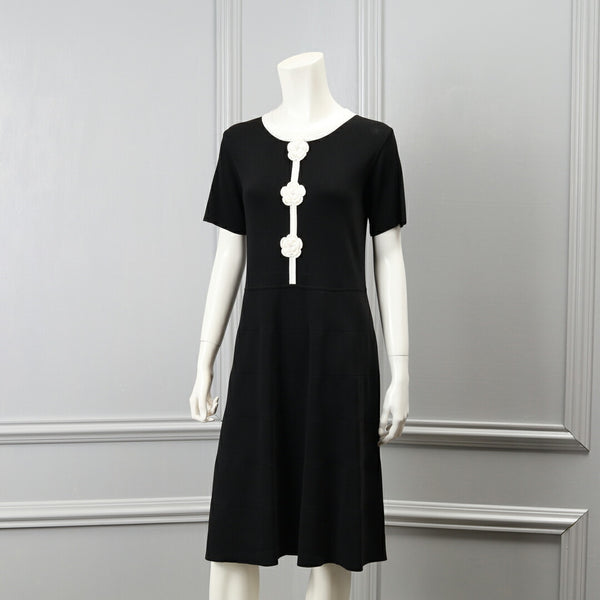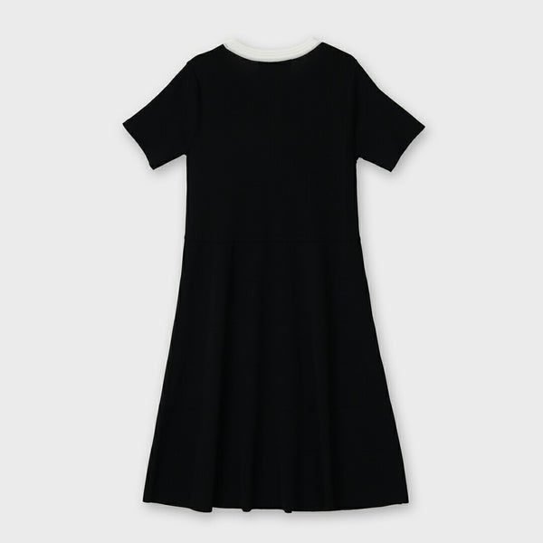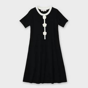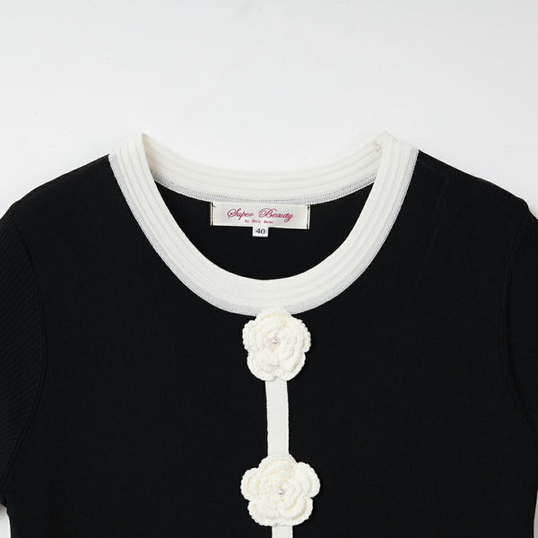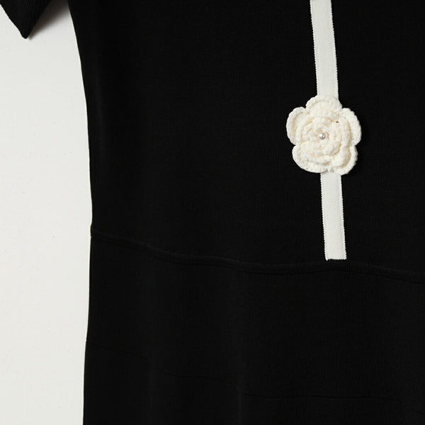 胸元に施した かぎ針花モチーフ が、柔らかな存在感を放つ配色ニットワンピース。