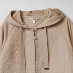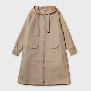 フード付きデザインは、トレンド感を漂わせつつも、毎日のコーディネートにぴったり。異素材ドッキングにより、ユニークな質感が楽しめます。