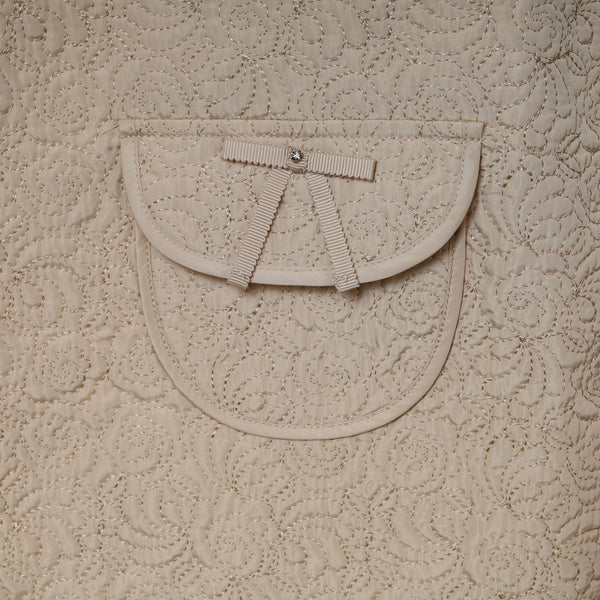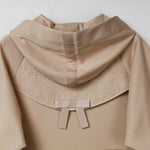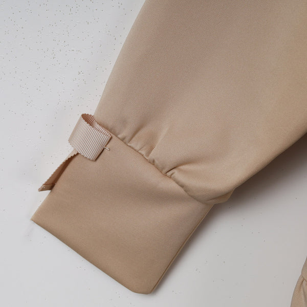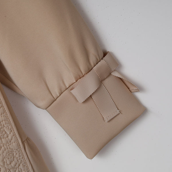 可愛らしいネックのグログランリボンや、ポケット口と袖口のリボンディテールが、さりげないアクセントとなり、女性らしさを引き立てます。